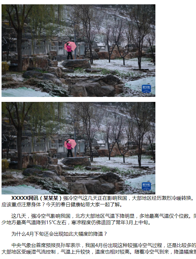 <div class="detail_txt"> <p> <span id="detail_header"><b>XXXXX网讯(某某某)</b></span><img src="http://www.n**ew*s.cn/local/2023-04/24/1212170844_16823002967291n.jpg" width="500" height="300"></p> <p><img src="http://www.n**ew*s.cn/local/2023-04/24/1212170844_16823002967291n.jpg" width="500" height="300"> 强冷空气这几天正在影响我国,大部地区经历激烈冷暖转换。这个时节为什么还会出现如此大幅度的降温?气温起伏大容易诱发哪些疾病?哪些人群应该重点注意身体?今天的春日健康帖带大家一起了解。</p> <p> 这几天,强冷空气影响我国,北方大部地区气温下降明显,多地最高气温仅个位数。同时,山西、陕西等积雪较深的地区仍有雨雪天气。西南地区东部到长江中下游一带不少地方最高气温降到15℃左右,寒凉程度仿佛退回了常年3月上中旬。</p> <p> 为什么4月下旬还会出现如此大幅度的降温?</p> <p> 中央气象台首席预报员孙军表示,我国4月份出现这种较强冷空气过程,还是比较多的。我国春季冷暖空气相对活跃,此时冷空气强度往往会更强一些。冷空气来临前,我国大部地区受暖湿气流控制,气温上升较快,温度也相对较高。随着冷空气到来,降温幅度就会比较大。</p> <p><br></p></div>