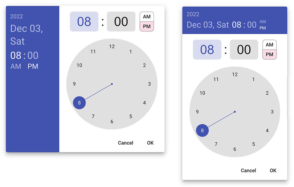 日期时间组件 datetimepicker 是在 v12 中添加的,同时也增加了 moment-adapter 日期模块。但是 datetimepicker 的时间选择模块并没有完全遵循 Material 规范(缺少时间输入模式),这也影响了很多需求的实现。在外国友人的帮助下,14.6.0 终于加上了时间输入功能,效果如下所示: