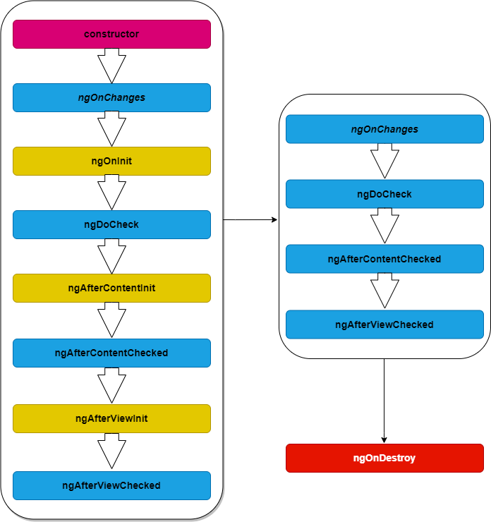 - ngOnChanges()--如果组件没有输入属性(@Input()),或者使用时没有提供任何输入属性,那么angular不会调用它;会调用多次。
