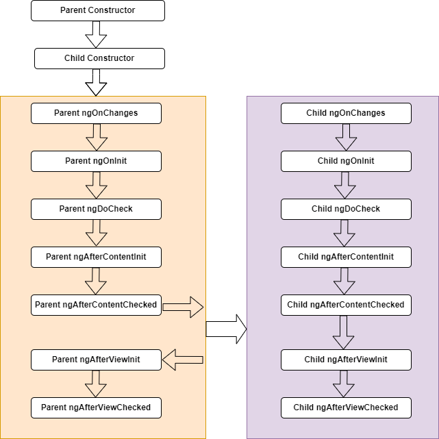 5.当发生变更检测时,父组件先触发ngDoCheck() => ngAfterContentChecked(),然后子组件触发 ngOnChanges() => ngDoCheck() => ngAfterContentChecked() => ngAfterViewChecked(),最后父组件调用ngAfterViewChecked()。