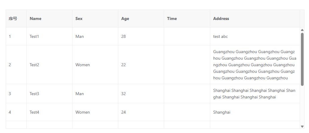 <template> <div> <vxe-grid v-bind="gridOptions" class="my-rdah-grid"></vxe-grid> </div></template><script setup>import { reactive } from 'vue'const gridOptions = reactive({ border: true, height: 400, rowConfig: { resizable: true }, columns: [ { type: 'seq', width: 70 }, { field: 'name', title: 'Name' }, { field: 'sex', title: 'Sex' }, { field: 'age', title: 'Age' }, { field: 'time', title: 'Time' }, { field: 'address', title: 'Address', width: 300 } ], data: [ { id: 10001, name: 'Test1', role: 'Develop', sex: 'Man', age: 28, address: 'test abc' }, { id: 10002, name: 'Test2', role: 'Test', sex: 'Women', age: 22, address: 'Guangzhou Guangzhou Guangzhou Guangzhou Guangzhou Guangzhou Guangzhou Guangzhou Guangzhou Guangzhou Guangzhou Guangzhou Guangzhou Guangzhou Guangzhou Guangzhou Guangzhou Guangzhou' }, { id: 10003, name: 'Test3', role: 'PM', sex: 'Man', age: 32, address: 'Shanghai Shanghai Shanghai Shanghai Shanghai Shanghai Shanghai Shanghai' }, { id: 10004, name: 'Test4', role: 'Designer', sex: 'Women', age: 24, address: 'Shanghai' }, { id: 10005, name: 'Test5', role: 'Designer', sex: 'Women', age: 24, address: 'Shanghai' }, { id: 10006, name: 'Test6', role: 'Designer', sex: 'Women', age: 24, address: 'shenzhen' }, { id: 10007, name: 'Test7', role: 'Designer', sex: 'Women', age: 24, address: 'shenzhen shenzhen shenzhen shenzhen shenzhen shenzhen shenzhen shenzhen shenzhen shenzhen' }, { id: 10008, name: 'Test8', role: 'Designer', sex: 'Women', age: 24, address: 'Shanghai' } ]})</script><style lang="scss" scoped>.my-rdah-grid { // 默认行高 --vxe-ui-table-row-height-default: 60px;}</style>