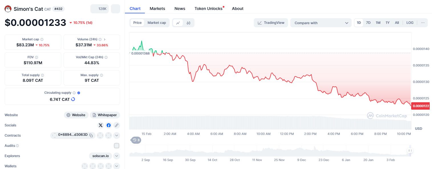 根据CoinMarketCap的价格数据显示,Simon's Cat (CAT)在当前时期呈现变化的市场环境。截至2025年2月14日,CAT价格为0.00001233美元,在过去24小时内下跌了10.75%。加密货币市场的价格不稳定性特别影响迷因币,Simon's Cat就是一个典型例子。
