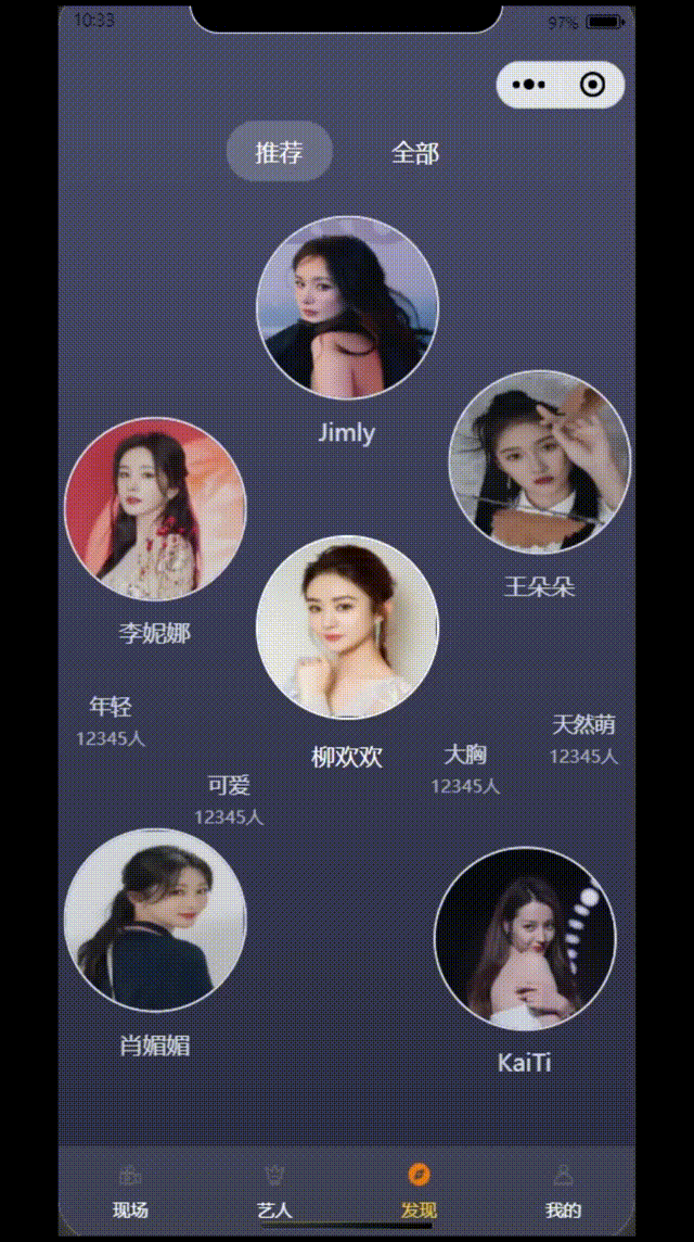const centerAvatar = ref('/static/discover/1.png');const centerName = ref('柳欢欢');const circleItems = ref([{ type: 'avatar', src: '/static/discover/2.png', name: 'Jimly', active: false, x: 0, y: -210, yOffset: 0 }, { type: 'avatar', src: '/static/discover/3.png', name: '李妮娜', active: false, x: -130, y: -80, yOffset: 0 }, { type: 'avatar', src: '/static/discover/4.png', name: '王朵朵', active: false, x: 130, y: -120, yOffset: 0 }, { type: 'tag', text: '年轻', count: '12345人', active: false, x: -160, y: 50, yOffset: 0 }, { type: 'tag', text: '天然萌', count: '12345人', active: false, x: 160, y: 60, yOffset: 0 }, { type: 'tag', text: '可爱', count: '12345人', active: false, x: -80, y: 90, yOffset: 0 }, { type: 'tag', text: '大胸', count: '12345人', active: false, x: 80, y: 80, yOffset: 0 }, { type: 'avatar', src: '/static/discover/5.png', name: '肖媚媚', active: false, x: -130, y: 200, yOffset: 0 }, { type: 'avatar', src: '/static/discover/6.png', name: 'KaiTi', active: false, x: 120, y: 200, yOffset: 0 }, ]); const bottomNavs = ref([{ text: '现场', icon: '/static/discover/live.png', activeIcon: '/static/discover/live_.png' }, { text: '艺人', icon: '/static/discover/artist.png', activeIcon: '/static/discover/artist_.png' }, { text: '发现', icon: '/static/discover/discover.png', activeIcon: '/static/discover/discover_.png' }, { text: '我的', icon: '/static/discover/my.png', activeIcon: '/static/discover/my_.png' }, ]); // 动画相关 const animateCircleItems = () => { setInterval(() => { circleItems.value.forEach((item, index) => { const yOffset = Math.sin((Date.now() / 1000 + index) * 2) * 10; // 计算上下移动的偏移量,可调整参数改变动画效果 item.yOffset = yOffset; }); }, 16); }; animateCircleItems();