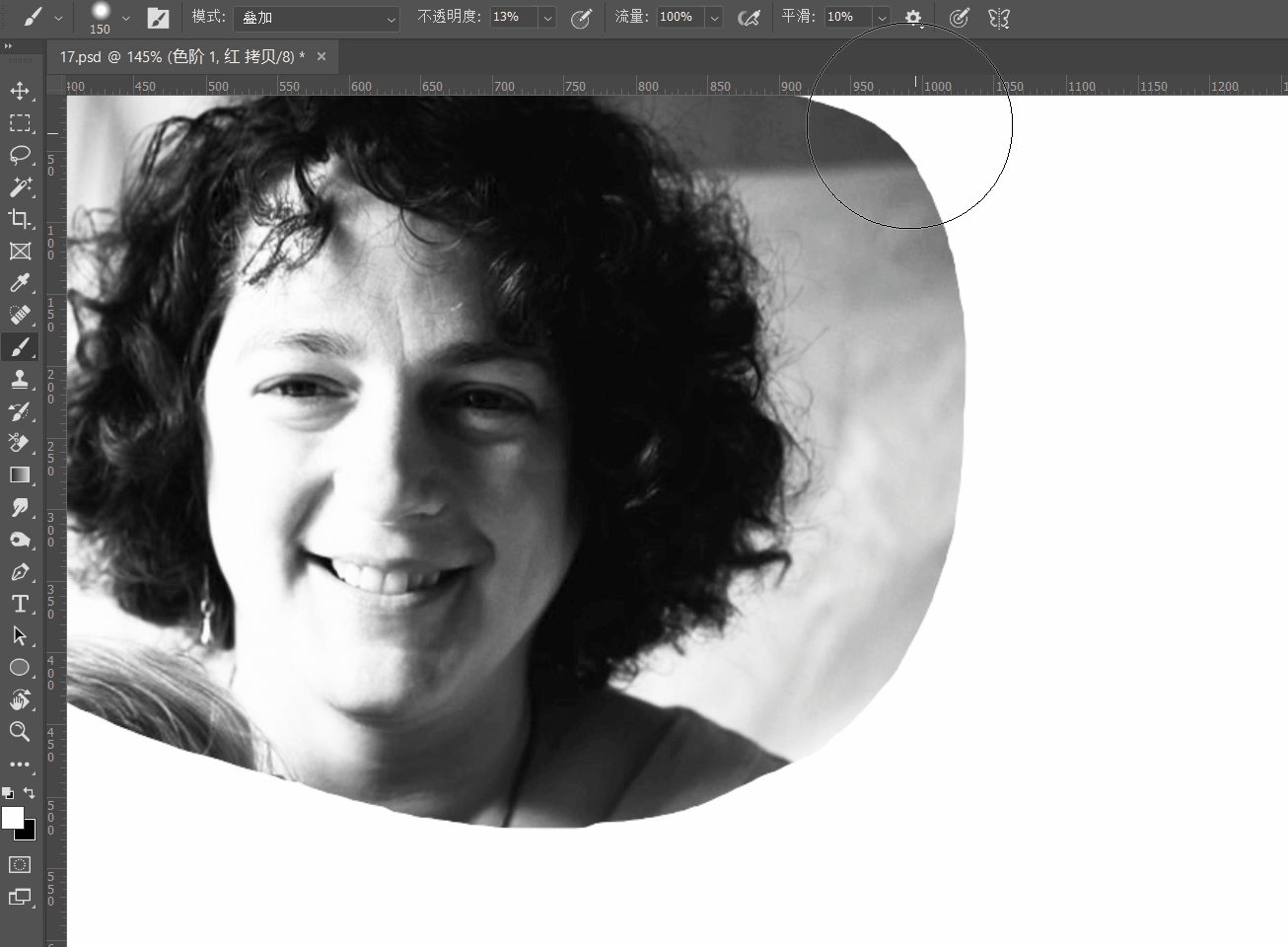 7、保持前景色为白色,切换到画笔工具,降低画笔不透明度,使用叠加模式在头发周围的黑色背景涂抹,将黑色背景变浅,方便下一步处理。
