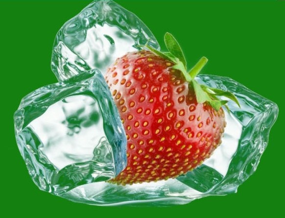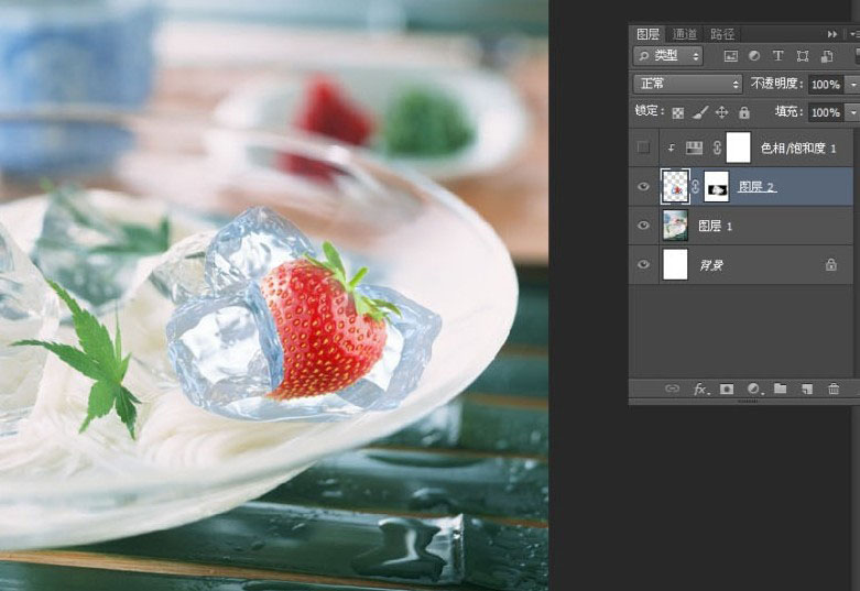 7、添加一个背景色,发现冰块是透明了,可草莓却变了样,不用着急,因为是在蒙版里操作的。
