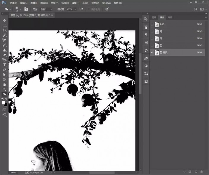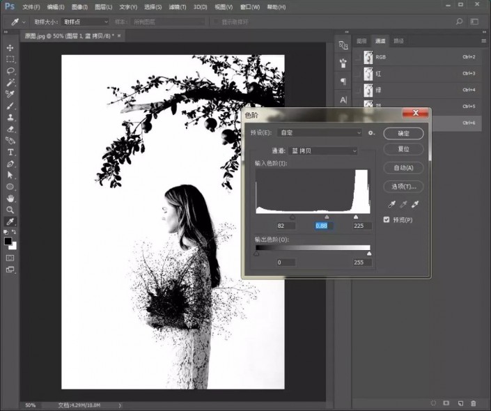 2.综上所看,我们选择复制蓝通道,按【ctrl+l】快捷键调出【色阶】进行调整,增强明暗对比。
