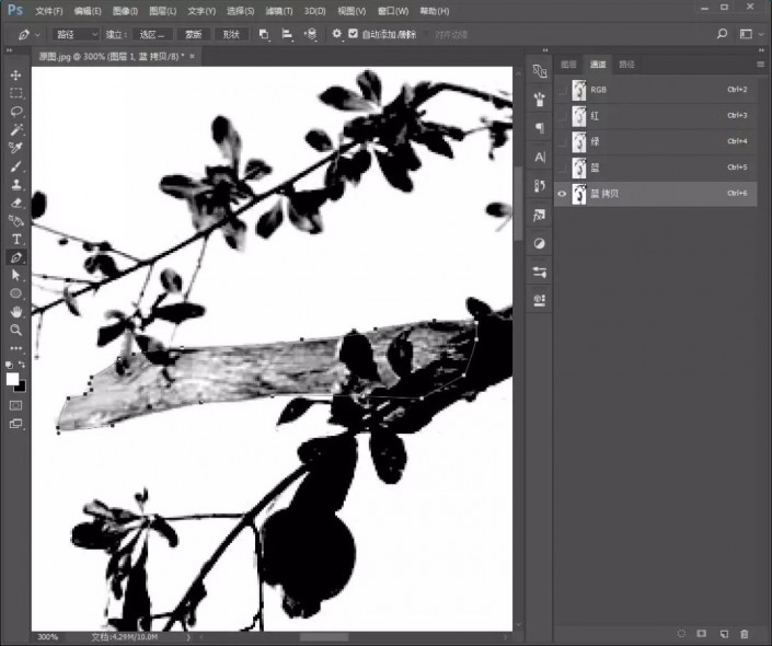 6.点击【RGB】颜色通道,再次选择【钢笔工具】扣选人物的衣服部分,然后转换为选区后,点击回到复制的蓝色通道,填充黑色。