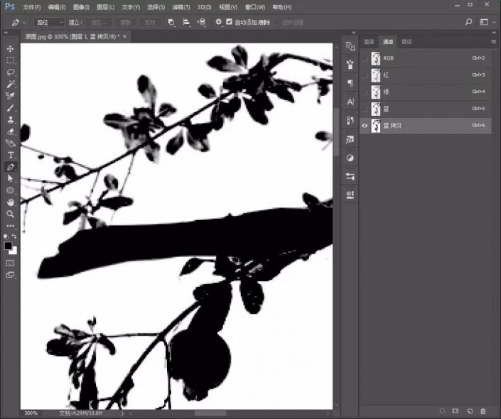 1.使用【PS】软件打开原图,点击通道面板,分别点击红、绿、蓝三个颜色通道查看,哪个与背景的反差最大。