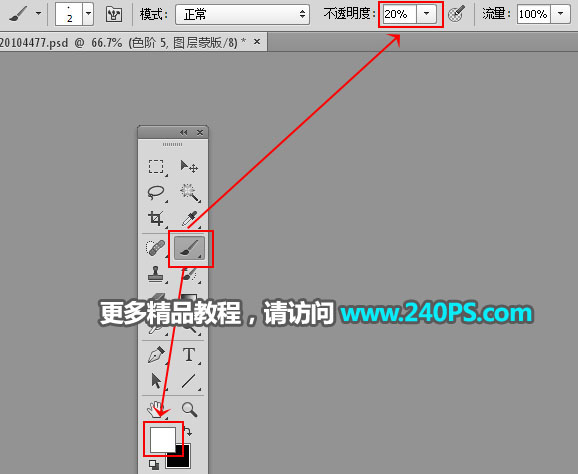 14、前景色设置为白色,选择画笔工具,画笔不透明度设置为20%,如下图。