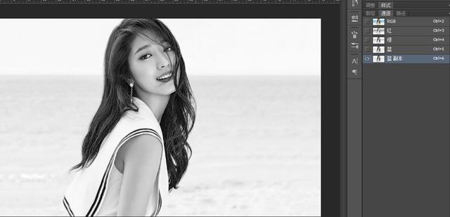 2.打开通道,分别观察红绿蓝通道哪一个反差比较大,这里以蓝通道为例,并复制一个蓝通道,如图: