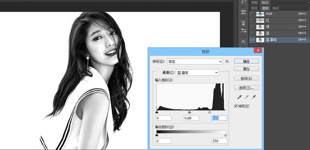 3.按Ctrl + L 调整色阶,调后面的高光滑块,边调边看发丝的变化,细节开始丢失时就不要再调了,如下图。
