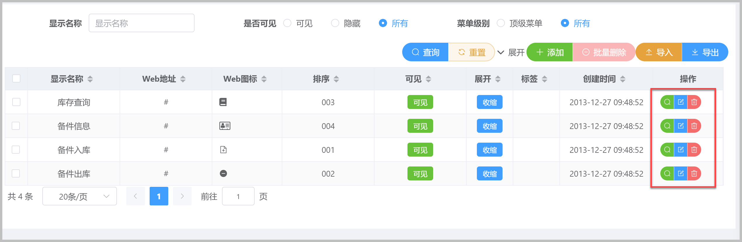 BS端的常规的列表页面内容和WInform端界面类似,也是包含一些查询条件,以及相关的入口按钮事件的处理,如下界面所示