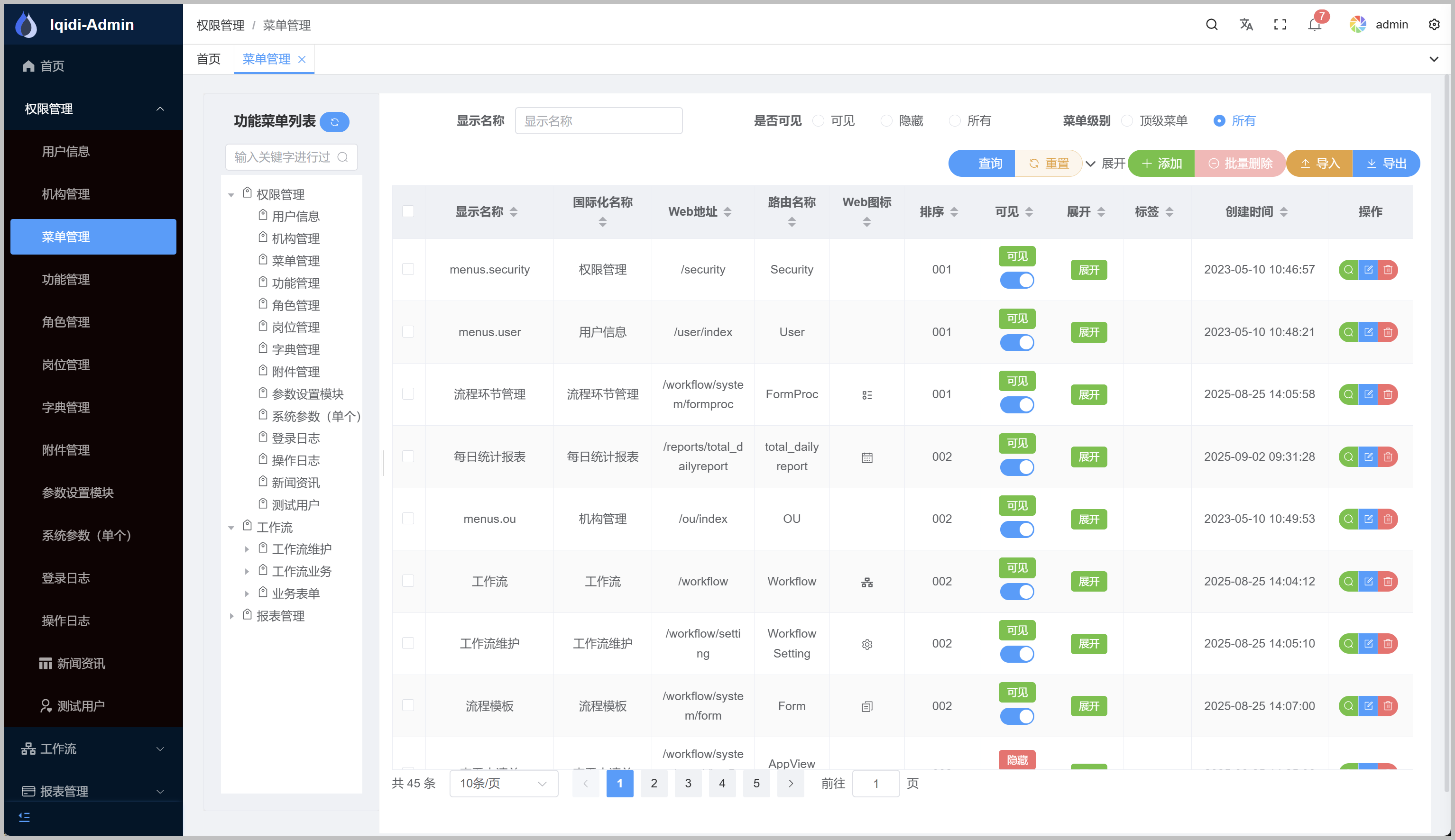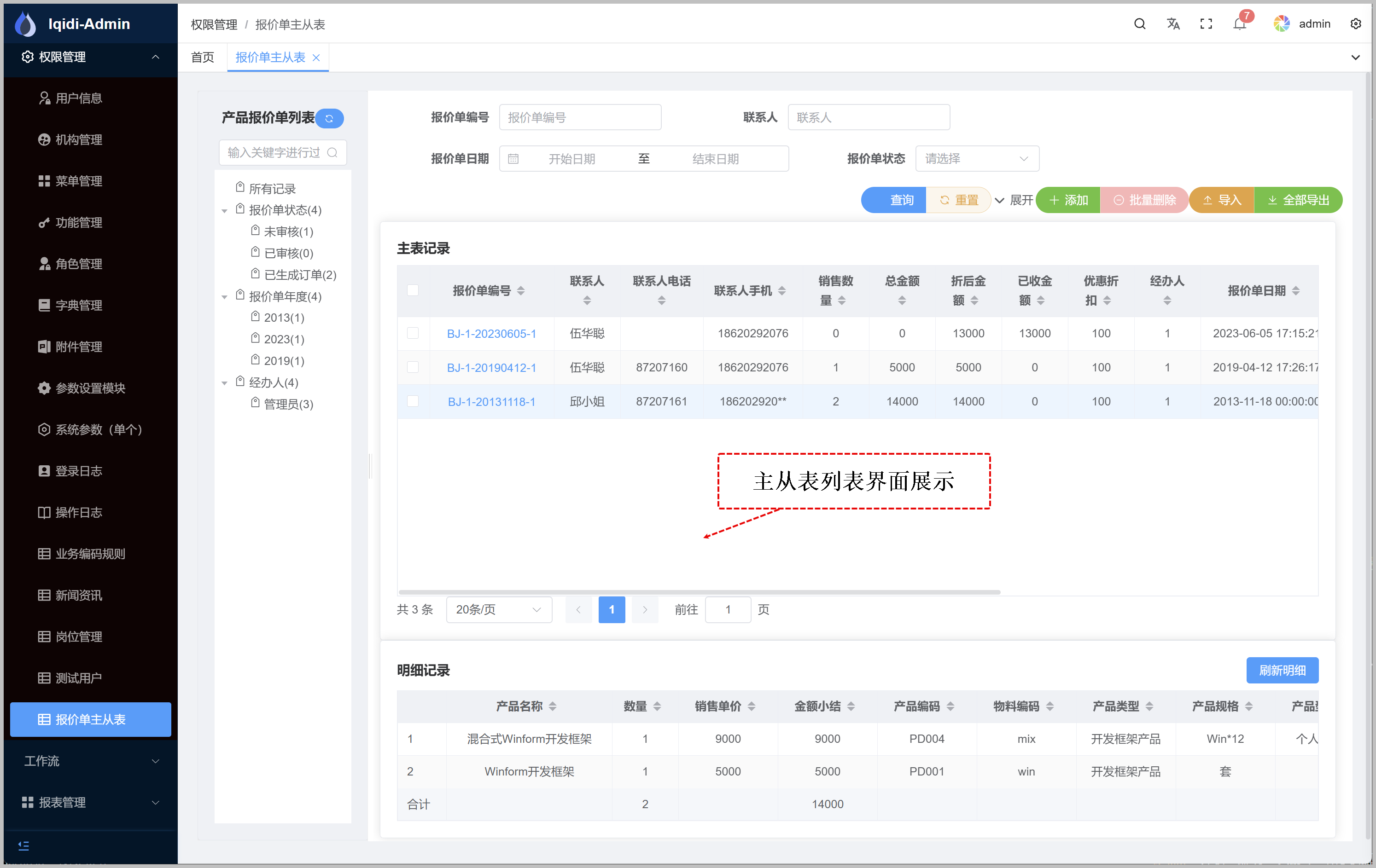 可以看到的内容,有树形列表、主表列表、从表展示,以及常规的增删改查的入口。