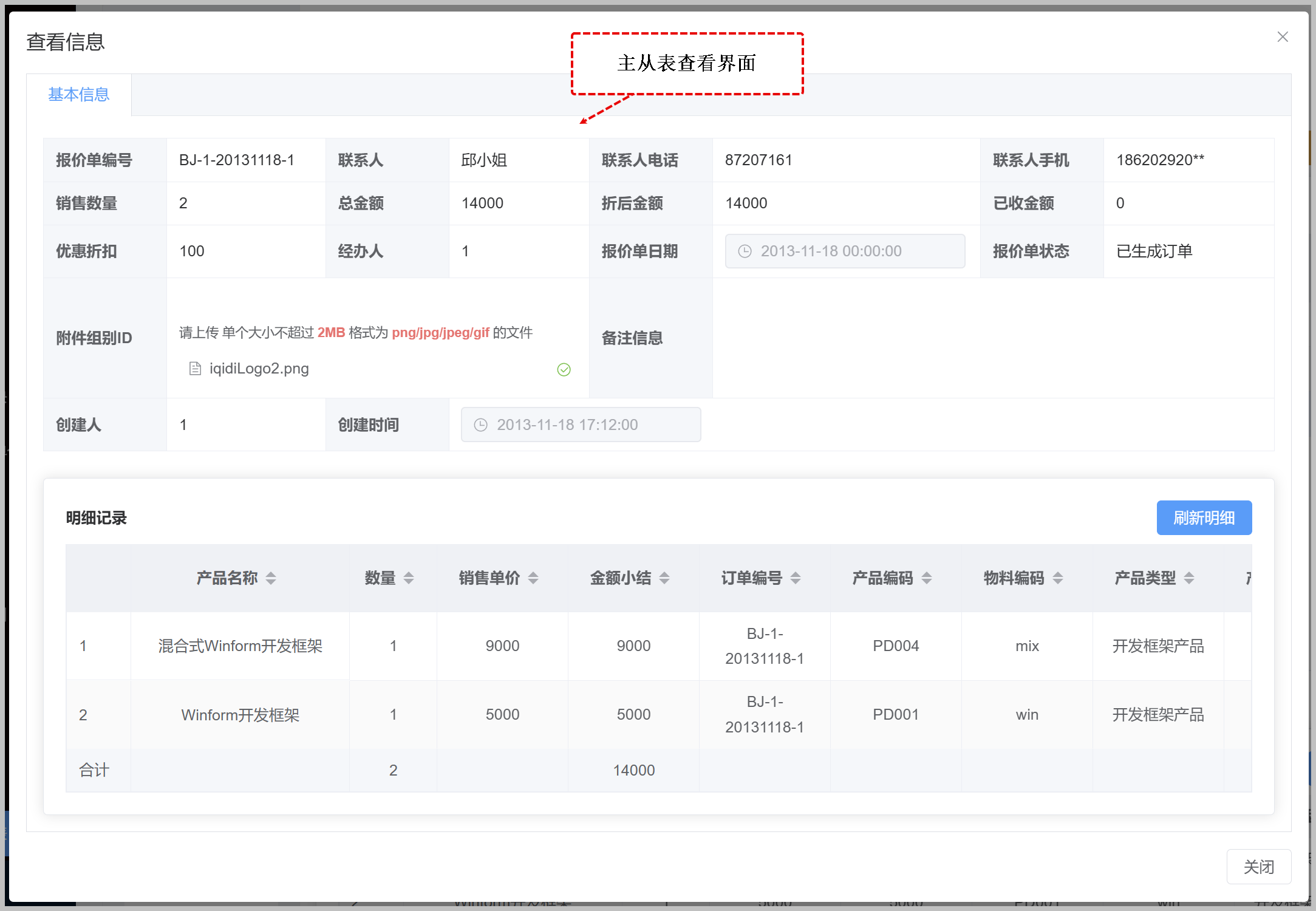 对于主从表的数据展示,也是同样通过定制的界面元素进行快速生成。