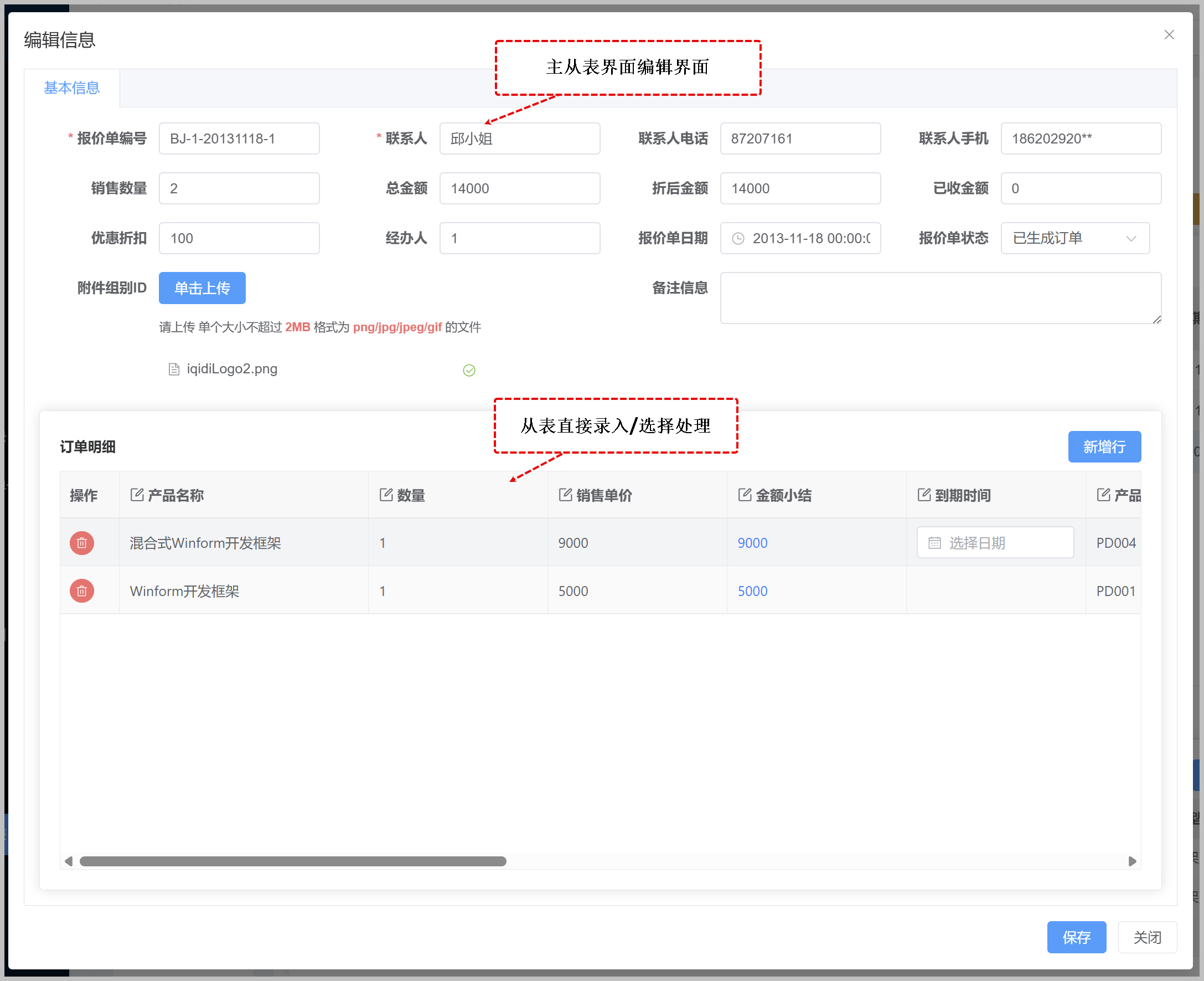 上面的代码生成,主要是针对单表的信息进行处理,在实际业务中,主从表的情况也是很常见的,如订单和订单明细,报价单和报价单明细,工艺和工艺路线,进货单和进货单明细等等,很常见的处理类型。