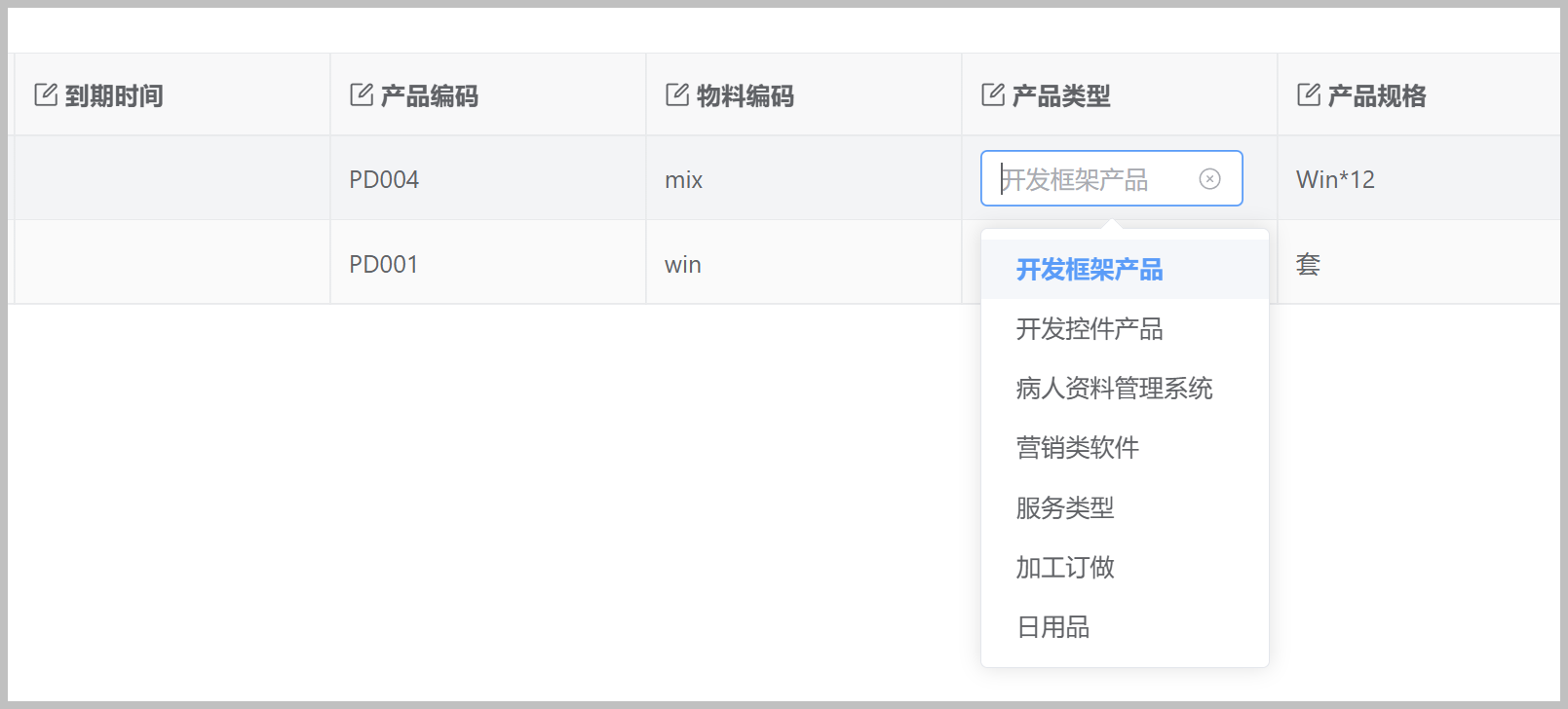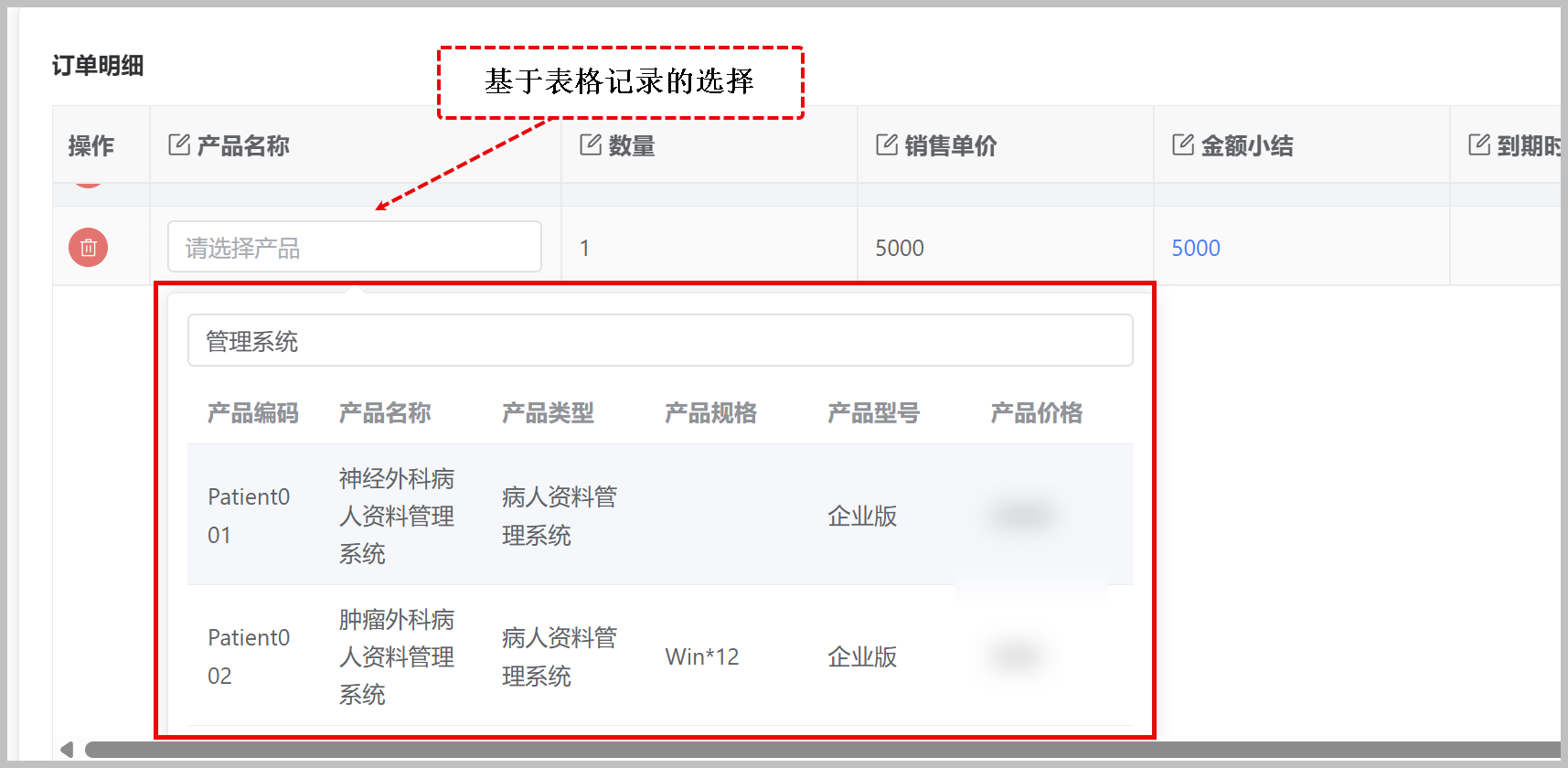 对应从表的记录,我们同通过表格录入的方式,可以输入或者选择内容进行填入。