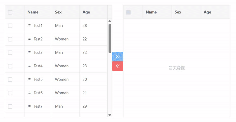 <template> <div> <div class="my-table-transfer"> <div class="my-table-transfer-left"> <vxe-grid ref="gridRef1" v-bind="gridOptions1"></vxe-grid> </div> <div class="my-table-transfer-handle"> <vxe-button status="primary" icon="vxe-icon-arrow-double-right" style="width: 100%;" @click="addEvent"></vxe-button> <vxe-button status="error" icon="vxe-icon-arrow-double-left" style="width: 100%;" @click="delEvent"></vxe-button> </div> <div class="my-table-transfer-right"> <vxe-grid ref="gridRef2" v-bind="gridOptions2"></vxe-grid> </div> </div> </div></template><script setup>import { ref, reactive } from 'vue'import { VxeUI } from 'vxe-pc-ui'const gridRef1 = ref()const gridRef2 = ref()const gridOptions1 = reactive({ border: true, showOverflow: true, height: '100%', rowConfig: { keyField: 'id', drag: true }, rowDragConfig: { isCrossDrag: true, isCrossTableDrag: true }, columns: [ { type: 'checkbox', width: 70 }, { field: 'name', title: 'Name', dragSort: true }, { field: 'sex', title: 'Sex' }, { field: 'age', title: 'Age' } ], data: [ { id: 10001, name: 'Test1', nickname: 'T1', role: 'Develop', sex: 'Man', age: 28, address: 'Shenzhen' }, { id: 10002, name: 'Test2', nickname: 'T2', role: 'Test', sex: 'Women', age: 22, address: 'Guangzhou' }, { id: 10003, name: 'Test3', nickname: 'T3', role: 'PM', sex: 'Man', age: 32, address: 'Shanghai' }, { id: 10004, name: 'Test4', nickname: 'T4', role: 'Designer', sex: 'Women', age: 23, address: 'test abc' }, { id: 10005, name: 'Test5', nickname: 'T5', role: 'Develop', sex: 'Women', age: 30, address: 'Shanghai' }, { id: 10006, name: 'Test6', nickname: 'T6', role: 'Designer', sex: 'Women', age: 21, address: 'Shenzhen' }, { id: 10007, name: 'Test7', nickname: 'T7', role: 'Test', sex: 'Man', age: 29, address: 'Shenzhen' }, { id: 10008, name: 'Test8', nickname: 'T8', role: 'Develop', sex: 'Man', age: 35, address: 'test abc' }, { id: 10009, name: 'Test9', nickname: 'T9', role: 'Develop', sex: 'Man', age: 35, address: 'Shenzhen' }, { id: 100010, name: 'Test10', nickname: 'T10', role: 'Develop', sex: 'Man', age: 35, address: 'Guangzhou' }, { id: 100011, name: 'Test11', nickname: 'T11', role: 'Develop', sex: 'Man', age: 49, address: 'Guangzhou' }, { id: 100012, name: 'Test12', nickname: 'T12', role: 'Develop', sex: 'Women', age: 45, address: 'Shanghai' }, { id: 100013, name: 'Test13', nickname: 'T13', role: 'Test', sex: 'Women', age: 35, address: 'Guangzhou' }, { id: 100014, name: 'Test14', nickname: 'T14', role: 'Test', sex: 'Man', age: 29, address: 'Shanghai' }, { id: 100015, name: 'Test15', nickname: 'T15', role: 'Develop', sex: 'Man', age: 39, address: 'Guangzhou' }, { id: 100016, name: 'Test16', nickname: 'T16', role: 'Test', sex: 'Women', age: 35, address: 'Guangzhou' }, { id: 100017, name: 'Test17', nickname: 'T17', role: 'Test', sex: 'Man', age: 39, address: 'Shanghai' }, { id: 100018, name: 'Test18', nickname: 'T18', role: 'Develop', sex: 'Man', age: 44, address: 'Guangzhou' }, { id: 100019, name: 'Test19', nickname: 'T19', role: 'Develop', sex: 'Man', age: 39, address: 'Guangzhou' }, { id: 100020, name: 'Test20', nickname: 'T20', role: 'Test', sex: 'Women', age: 35, address: 'Guangzhou' }, { id: 100021, name: 'Test21', nickname: 'T21', role: 'Test', sex: 'Man', age: 39, address: 'Shanghai' }, { id: 100022, name: 'Test22', nickname: 'T22', role: 'Develop', sex: 'Man', age: 44, address: 'Guangzhou' } ]})const gridOptions2 = reactive({ border: true, showOverflow: true, height: '100%', rowConfig: { keyField: 'id', drag: true }, rowDragConfig: { isCrossDrag: true, isCrossTableDrag: true }, columns: [ { type: 'checkbox', width: 70 }, { field: 'name', title: 'Name', dragSort: true }, { field: 'sex', title: 'Sex' }, { field: 'age', title: 'Age' } ], data: []})const addEvent = () => { const $grid1 = gridRef1.value const $grid2 = gridRef2.value if ($grid1 && $grid2) { const selectRecords = $grid1.getCheckboxRecords() if (selectRecords.length) { $grid1.remove(selectRecords) $grid2.insertAt(selectRecords, -1) } else { VxeUI.modal.message({ content: '请勾选左侧数据', status: 'warning' }) } }}const delEvent = () => { const $grid1 = gridRef1.value const $grid2 = gridRef2.value if ($grid1 && $grid2) { const selectRecords = $grid2.getCheckboxRecords() if (selectRecords.length) { $grid2.remove(selectRecords) $grid1.insertAt(selectRecords, -1) } else { VxeUI.modal.message({ content: '请勾选右侧数据', status: 'warning' }) } }}</script><style lang="scss" scoped>.my-table-transfer { display: flex; height: 400px; overflow: hidden;}.my-table-transfer-handle { display: flex; flex-direction: column; justify-content: center; flex-shrink: 0; width: 40px;}.my-table-transfer-left,.my-table-transfer-right { width: 50%; overflow: hidden;}</style>