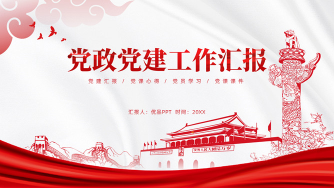 党政党建工作总结PPT模板。一套党政主题幻灯片模板,大气红色主色调,天安门、华表背景,适合党建工作汇报。