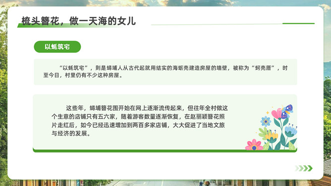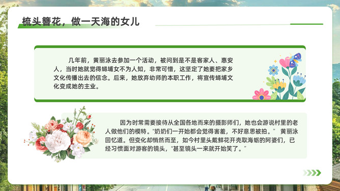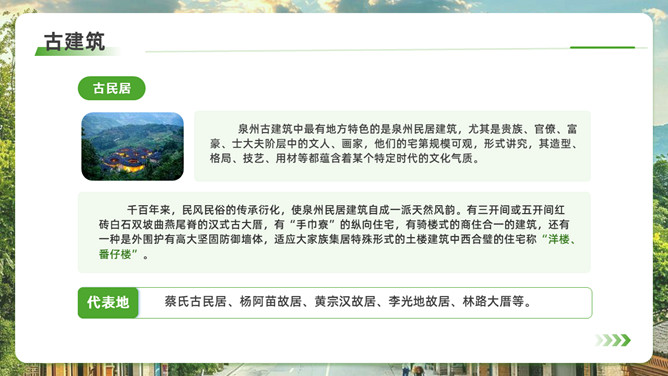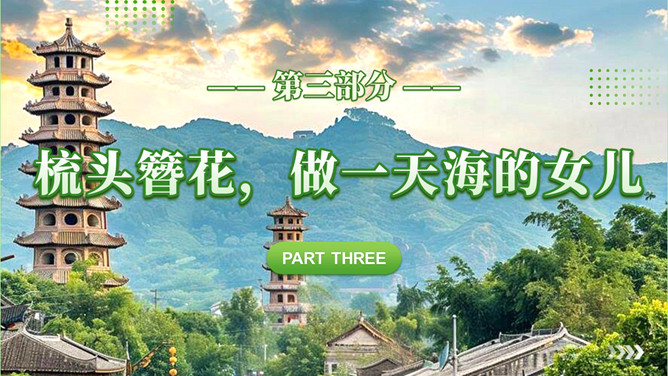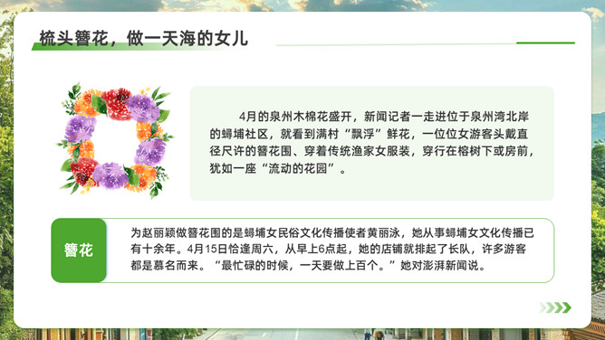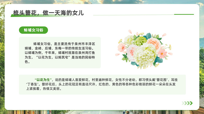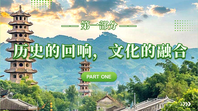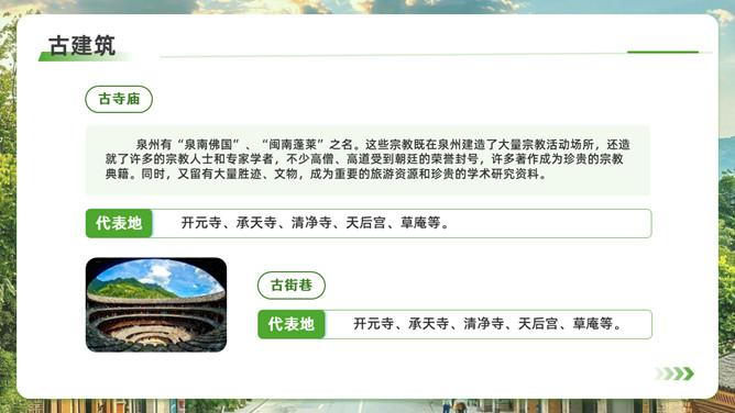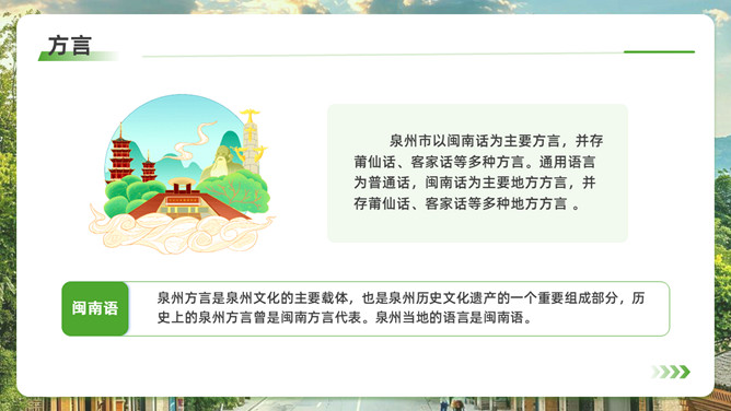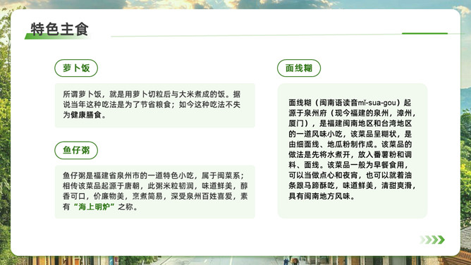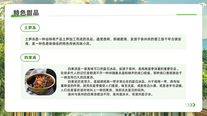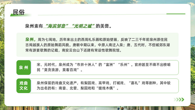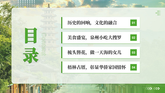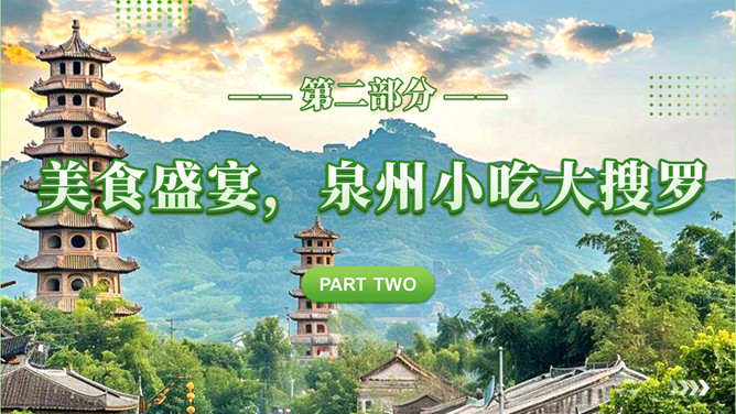 泉州l旅游攻略PPT模板。内容包括:历史的回响,文化的融合。美食盛宴,泉州小吃大搜罗。梳头簪花,做一天海的女儿。梧林古厝,彰显华侨家国情怀。