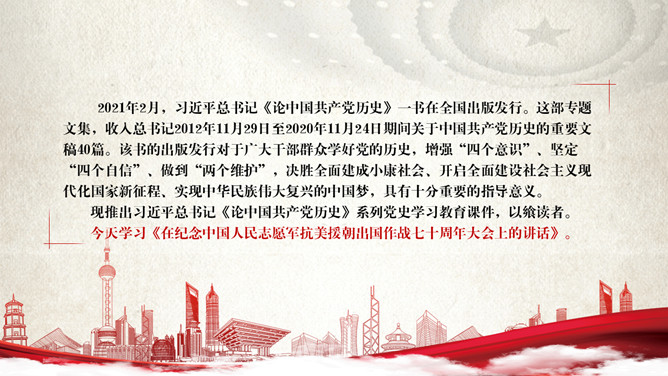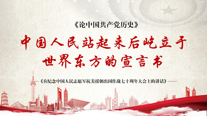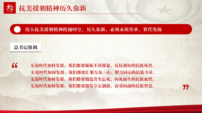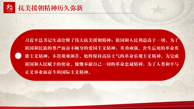 纪念抗美援朝胜利PPT模板。包括抗美援朝战争伟大胜利、巨大贡献、历史启示等内容。