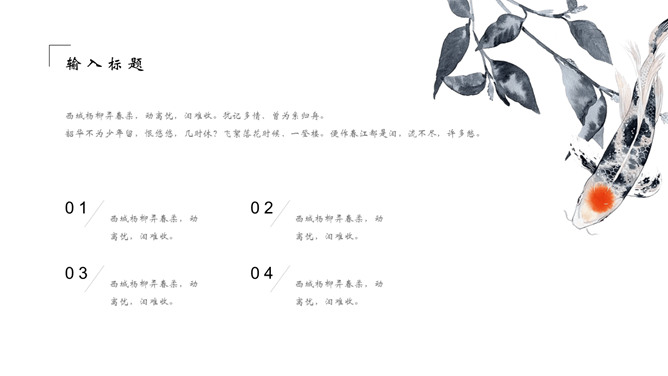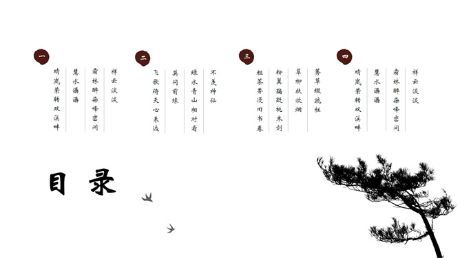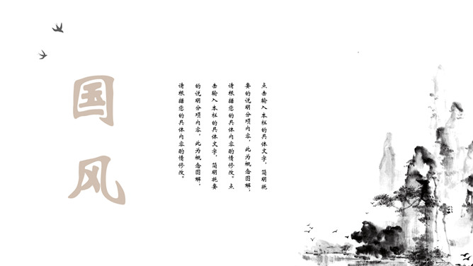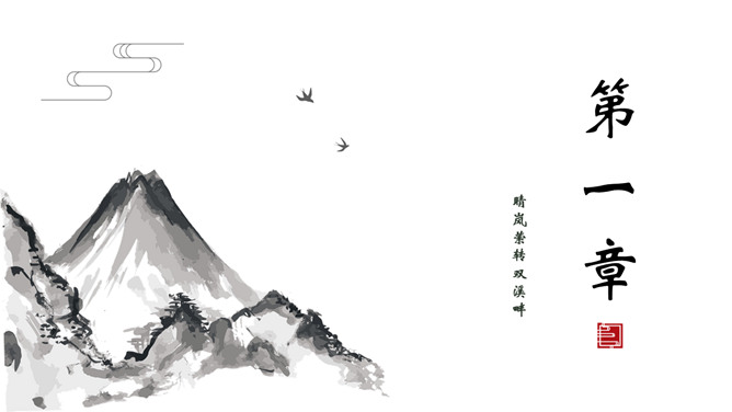 红日水墨国风PPT模板。一套简洁中国风幻灯片模板,红日、燕子、云纹首页背景,页面类型多样,实用性强。