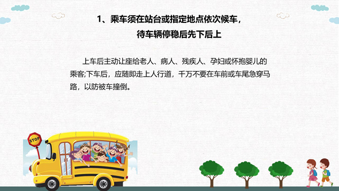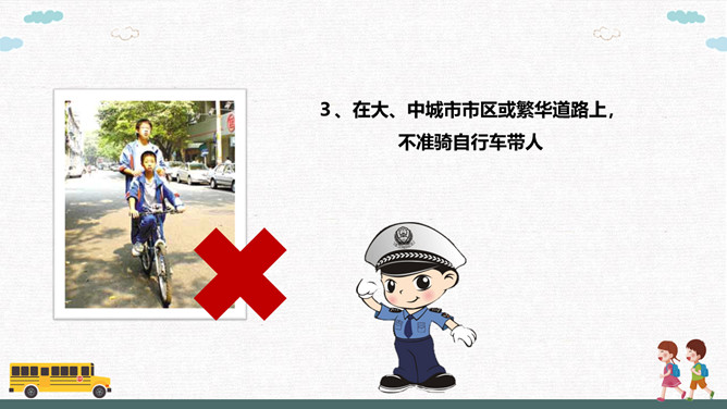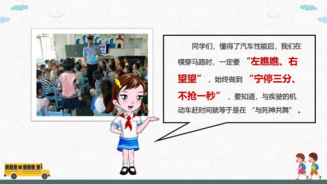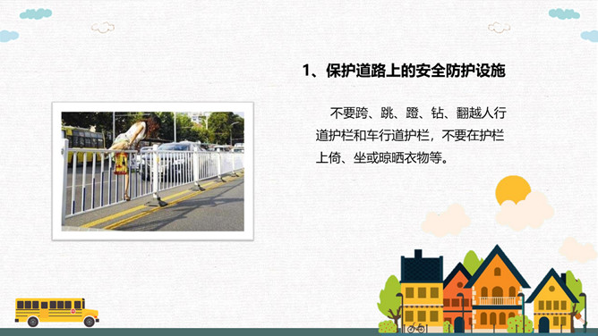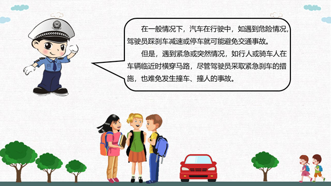 安全出行知危险会避险PPT模板。内容包括汽车的惯性、自行车使用常识、乘车须知、爱护交通设施、马路不是游戏场、上放学和外出活动。