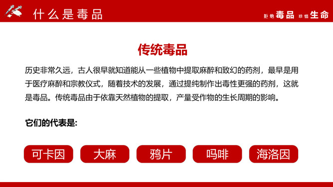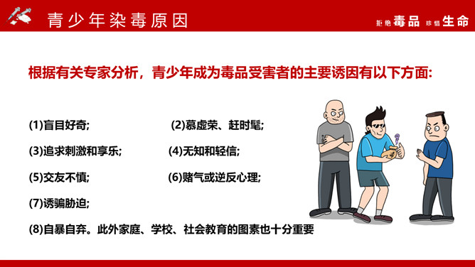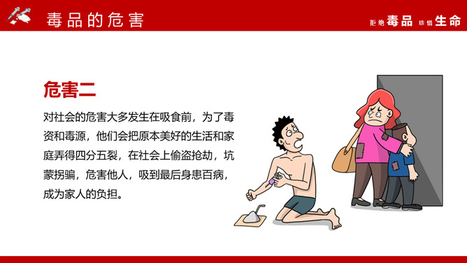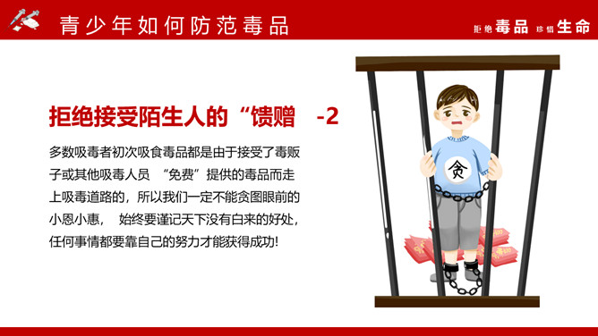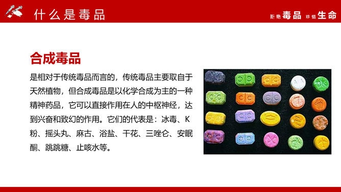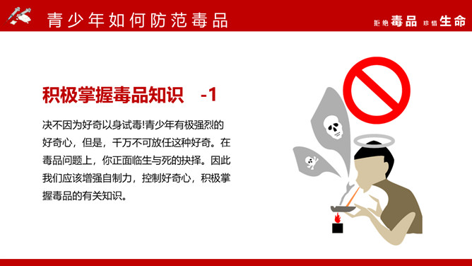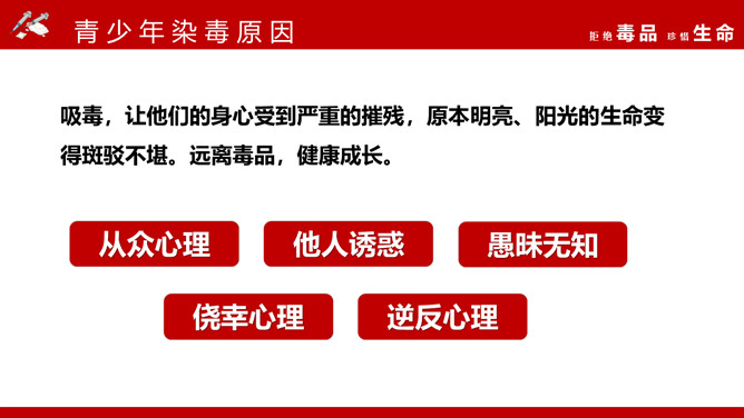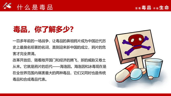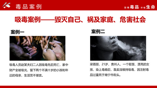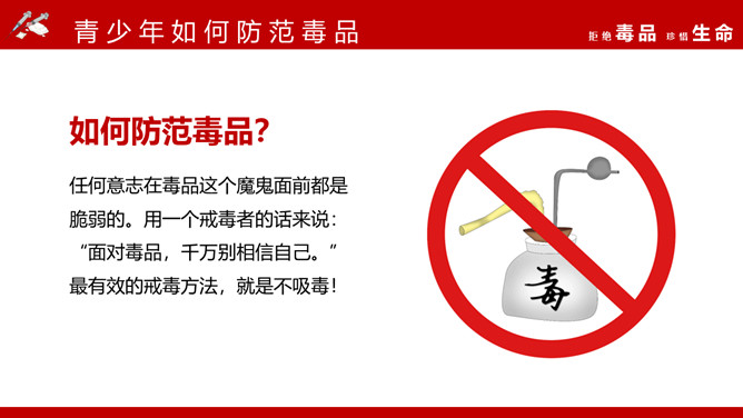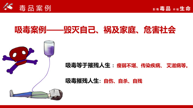 拒绝毒品珍惜生命班会PPT模板。内容包括什么是毒品、毒品危害、吸毒案例、青少年吸毒原因、如何防范拒绝毒品。
