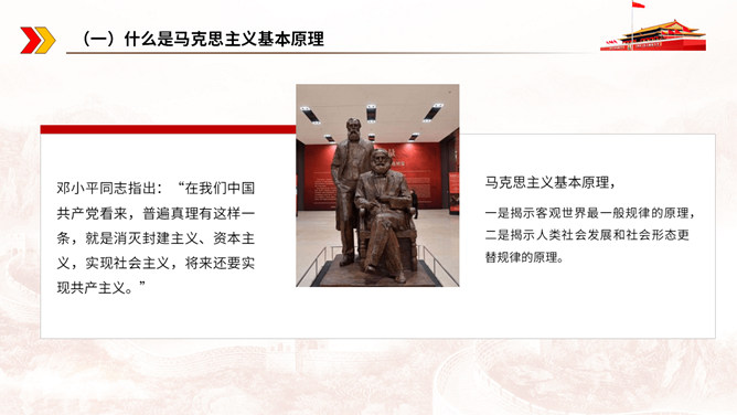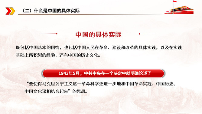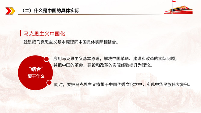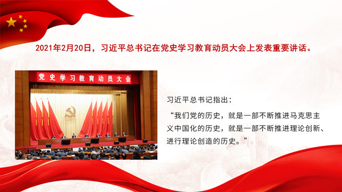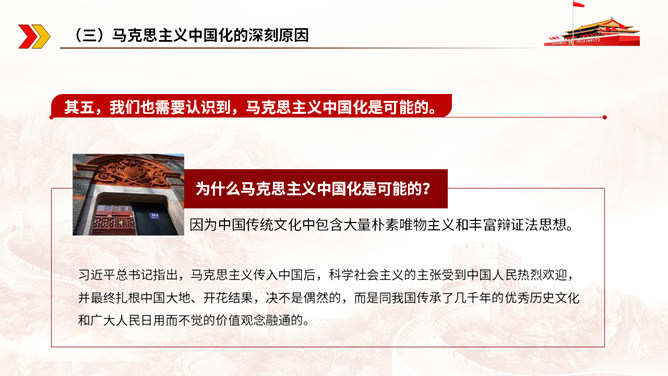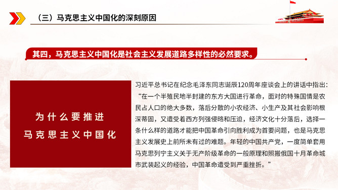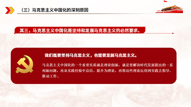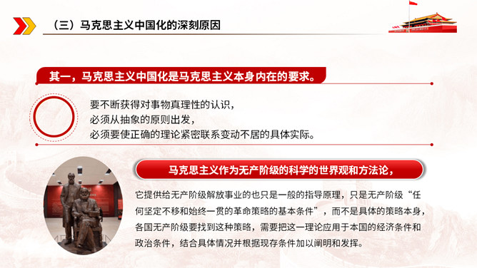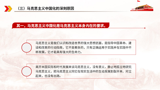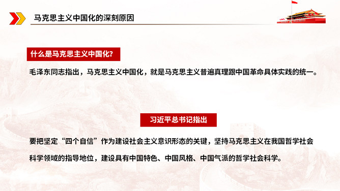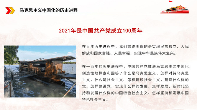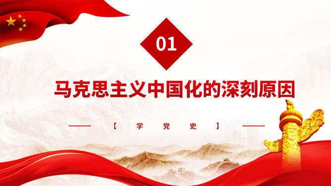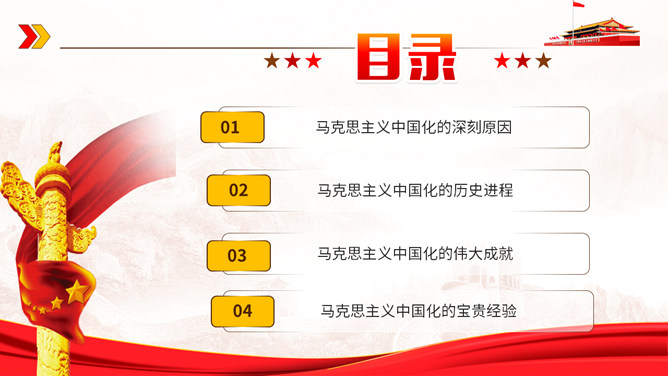 马克思主义中国化的百年历程PPT模板。内容包括马克思主义中国化的深刻原因和历史进程、马克思主义中国化的伟大成就和宝贵经验。