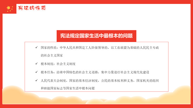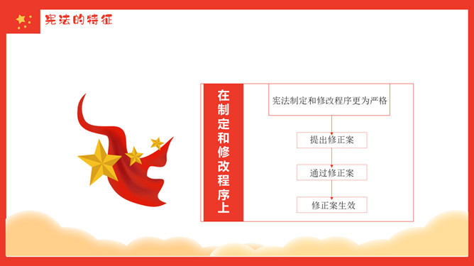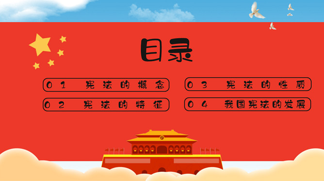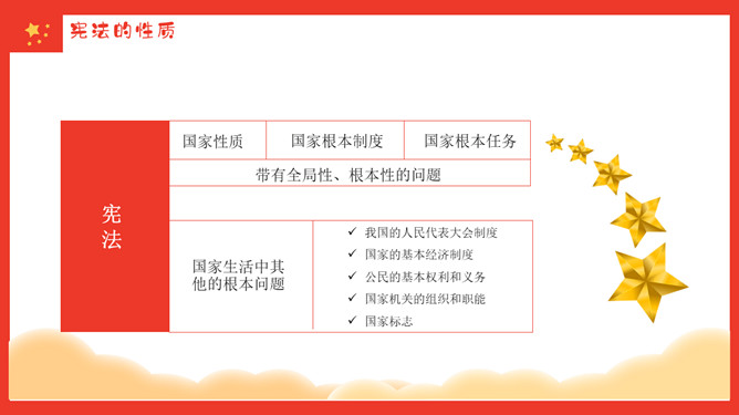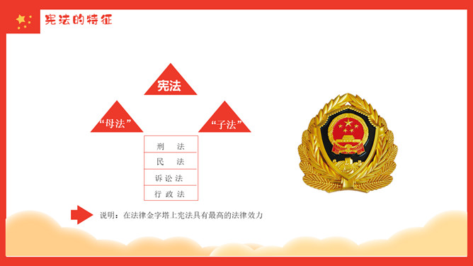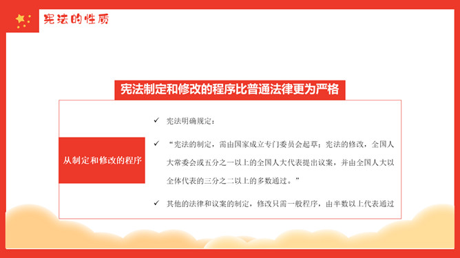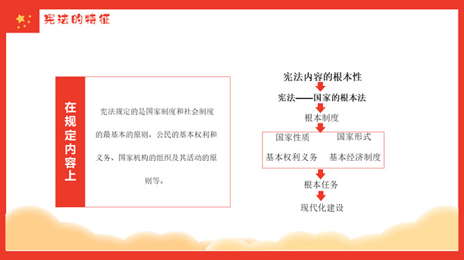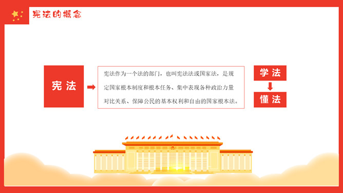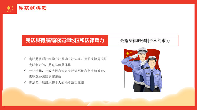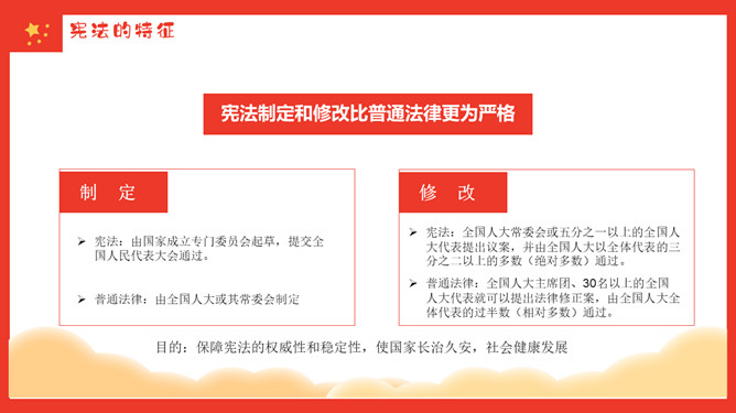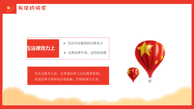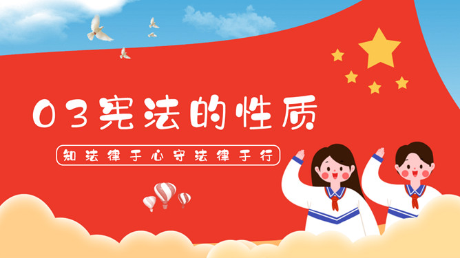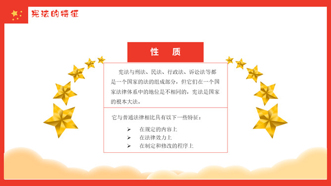 学宪法讲宪法法制教育PPT模板。内容包括宪法的概念、宪法的特征、宪法的性质、我国宪法的发展。