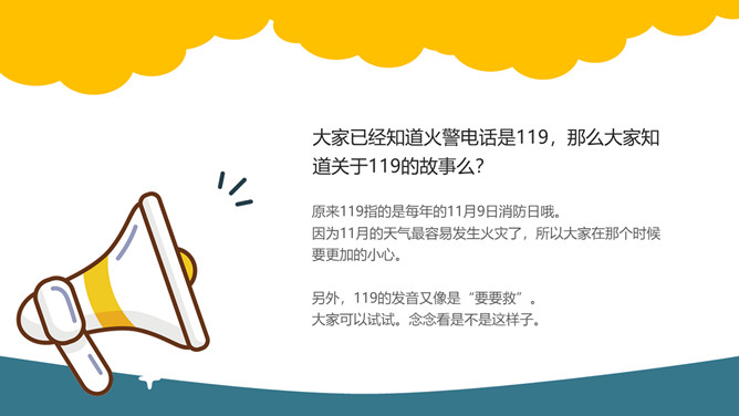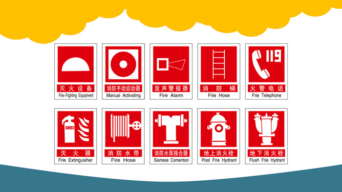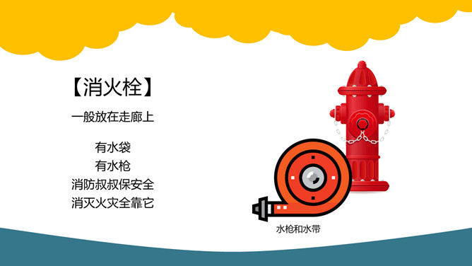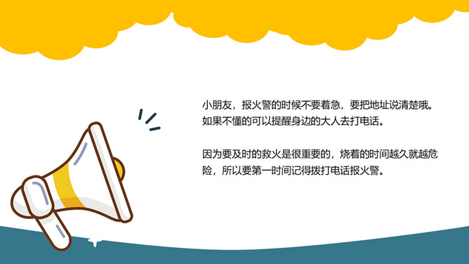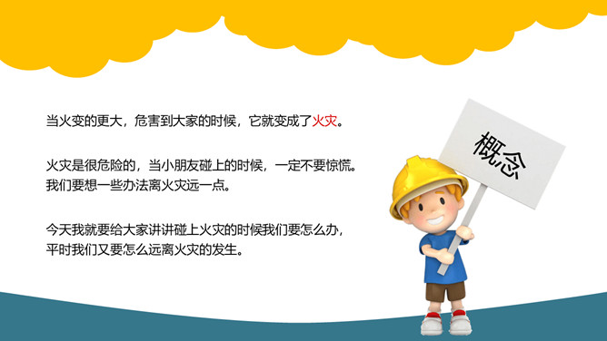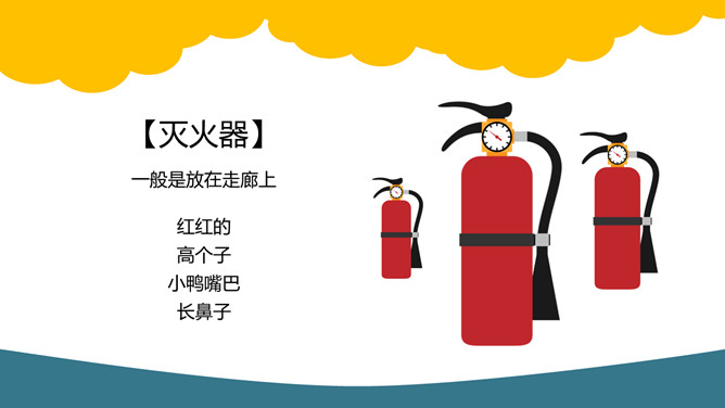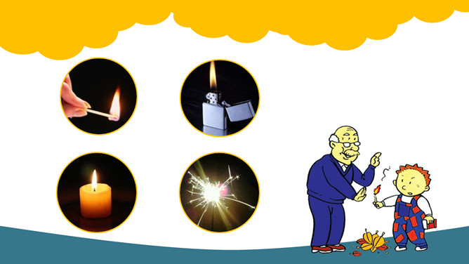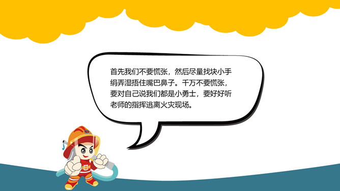 小学生消防安全教育课件PPT模板。内容包括:什么是火灾?报火警、认识日常生活中的消防器材、一些常见的消防标识、需要注意的易燃品、教育小朋友如何逃生、火灾要注意的事项、小儿歌。