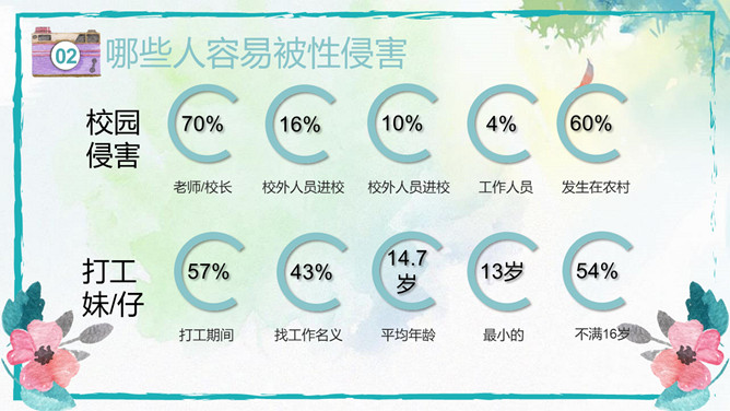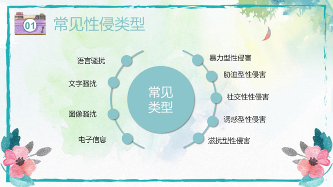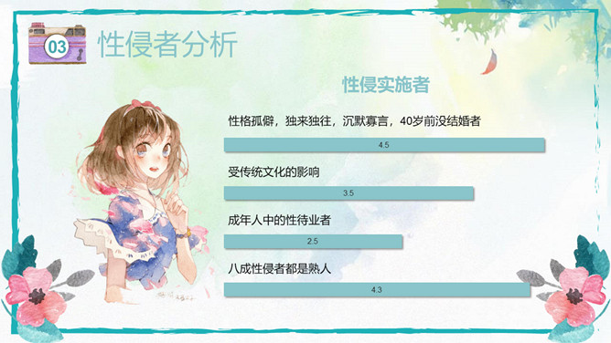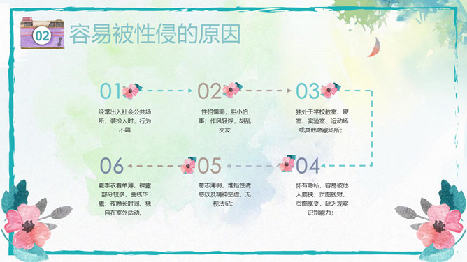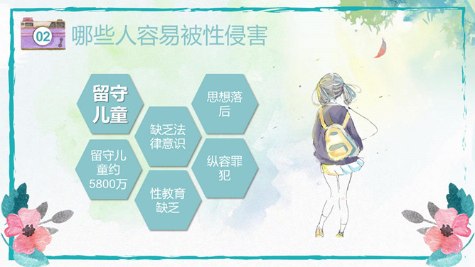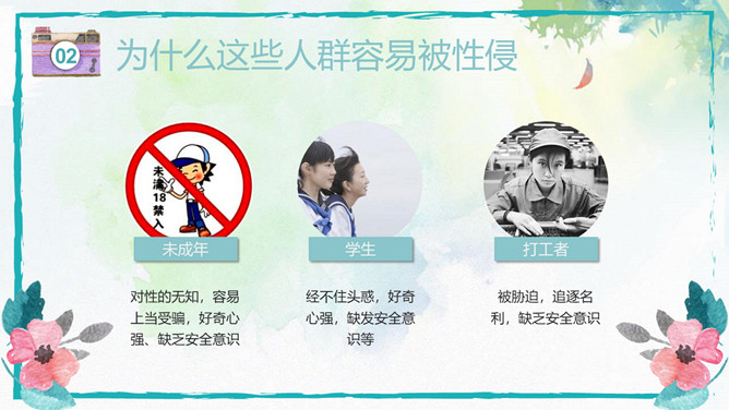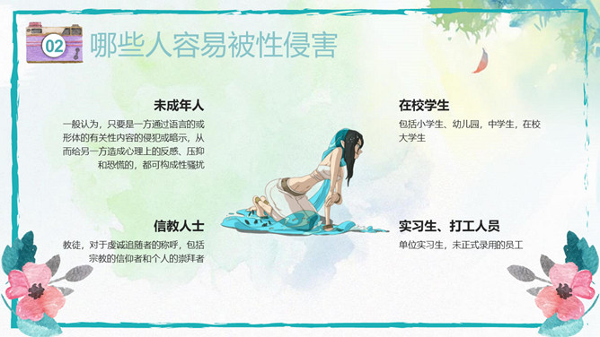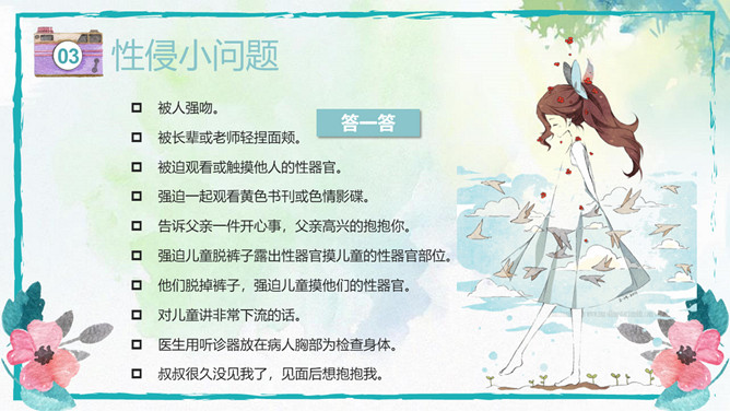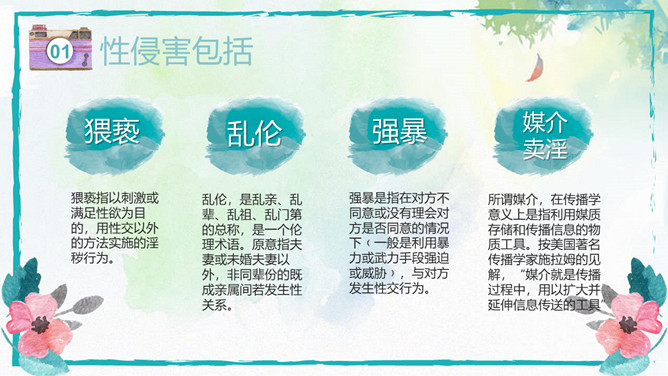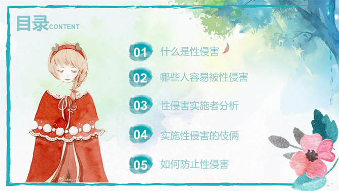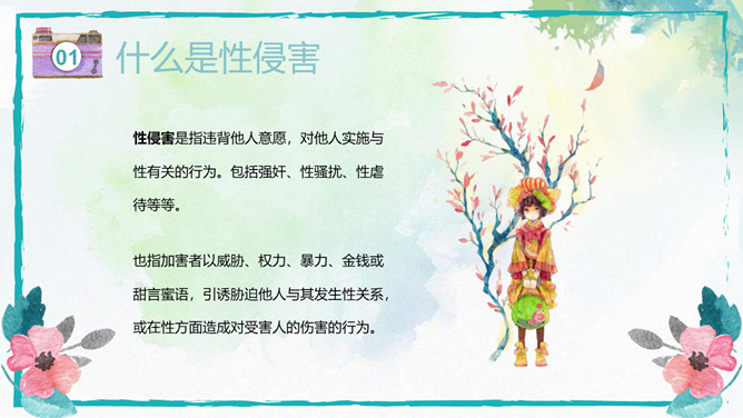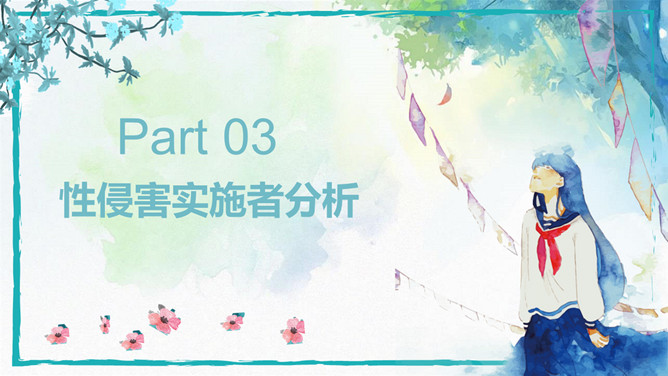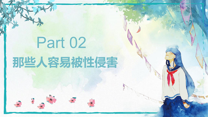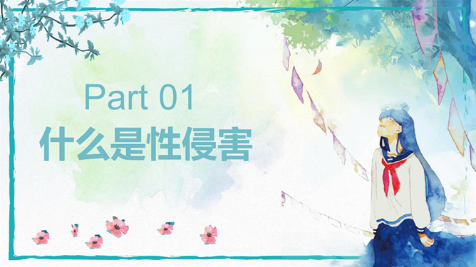预防性侵害安全教育班会PPT模板。内容包括什么是性侵害、哪些人容易被性侵害、性侵害实施者分析、实施性侵害的伎俩、如何防止性侵害。