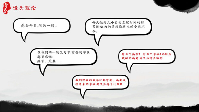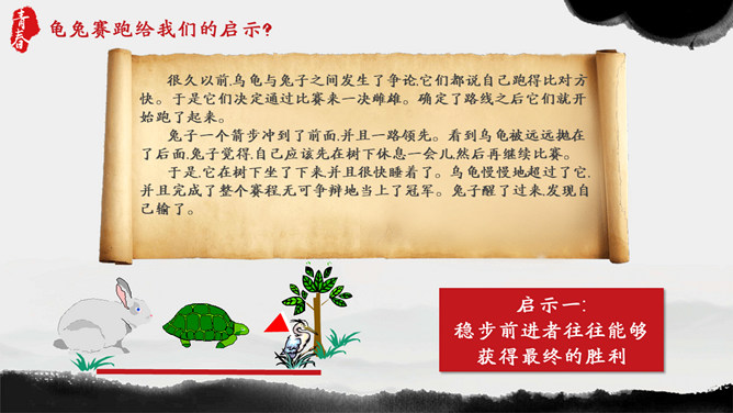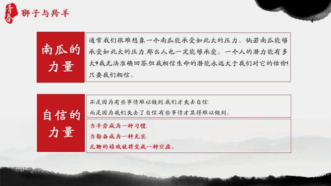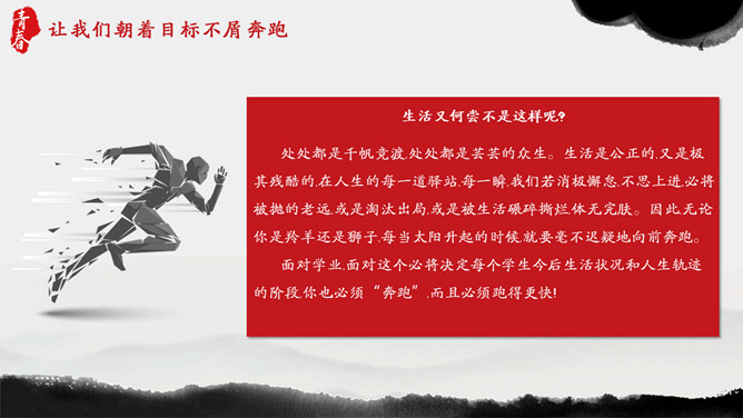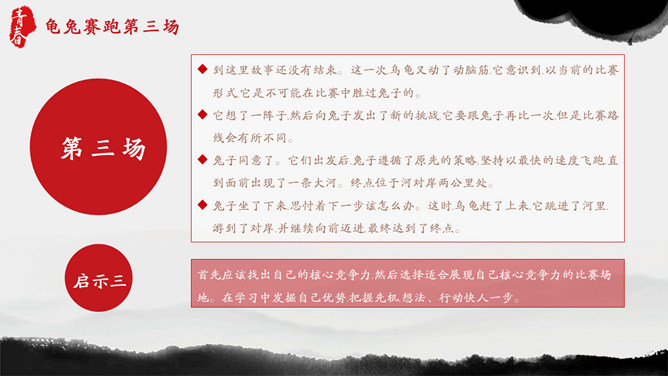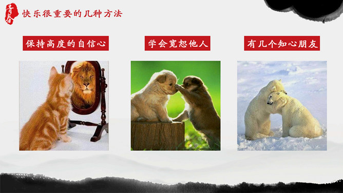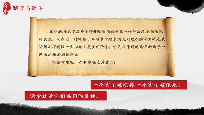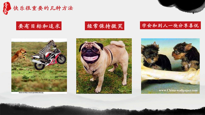 青春正能量励志主题班会PPT模板。内容包括狮子与羚羊、龟兔赛跑、馒头理论、快乐很重要。
