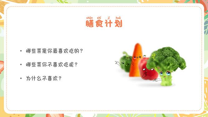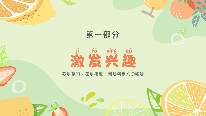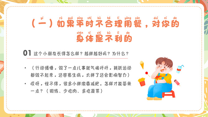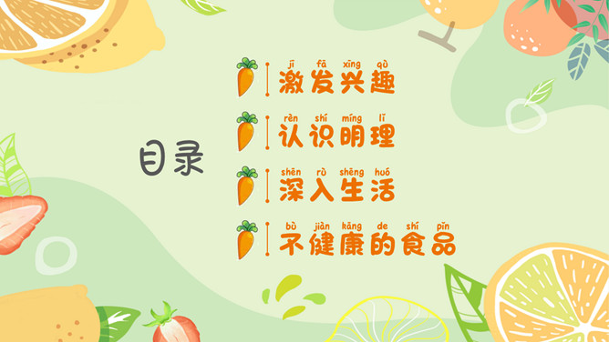 小学生营养膳食班会课件PPT模板。内容包括激发兴趣、认识明理、深入生活、不健康的食品。