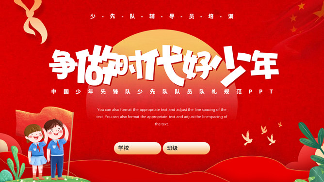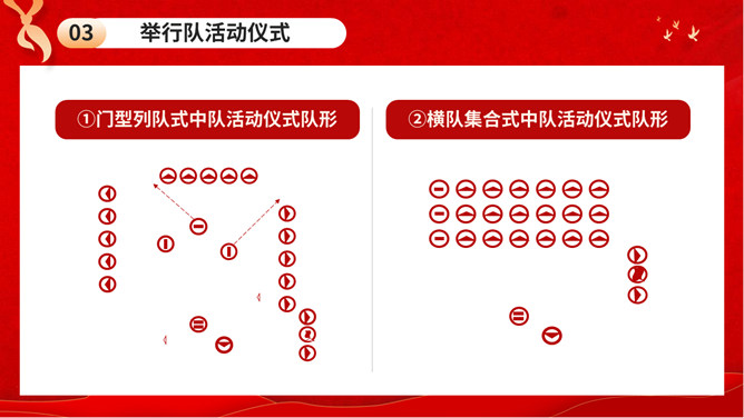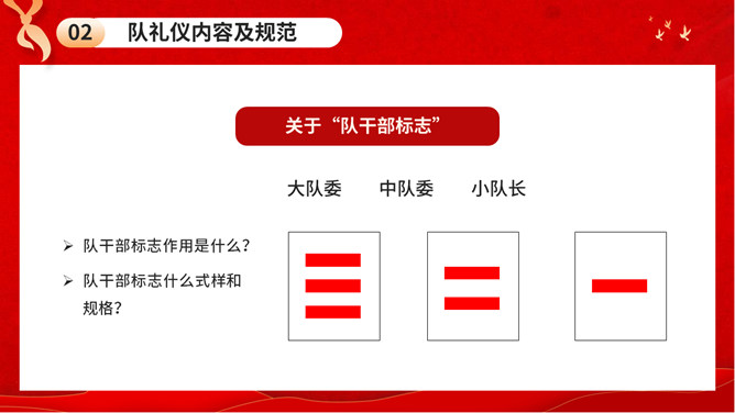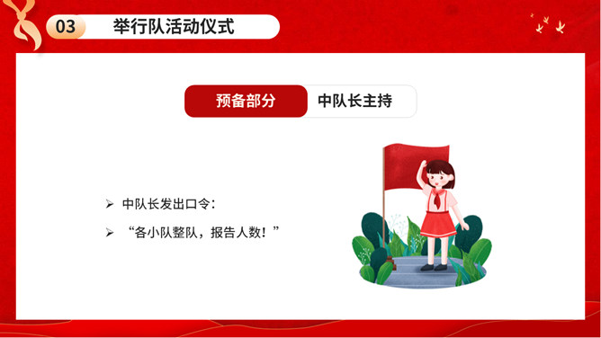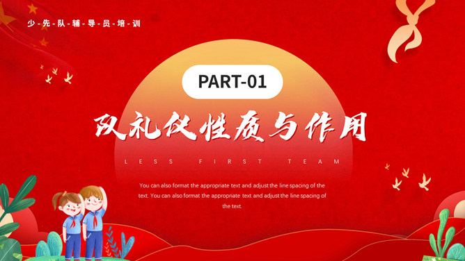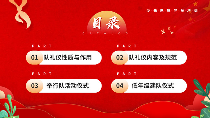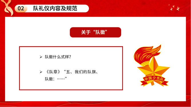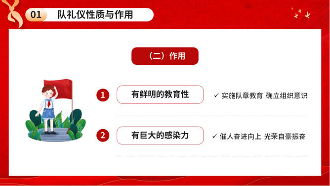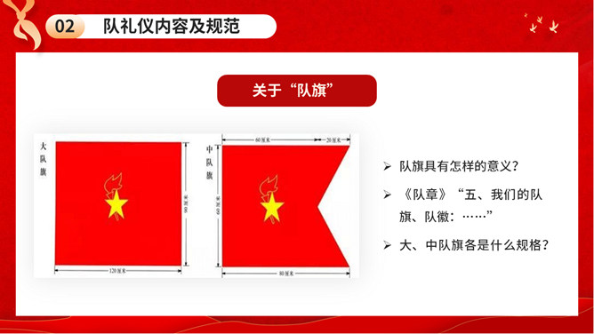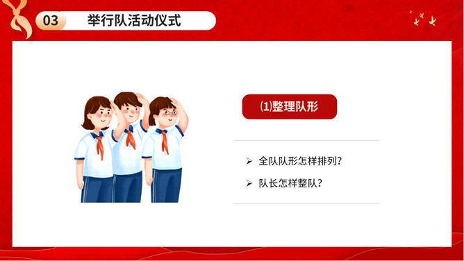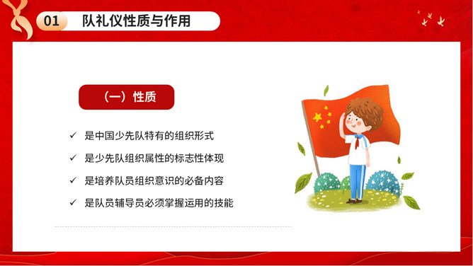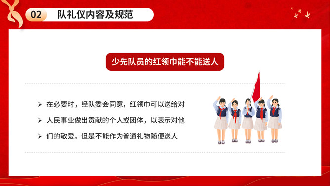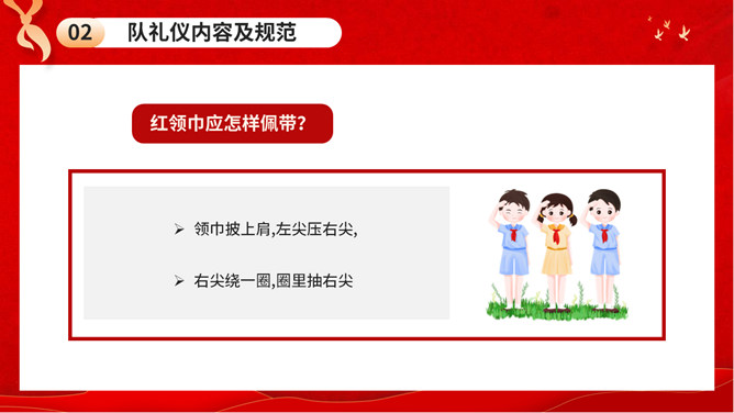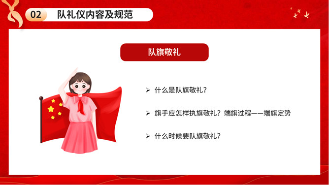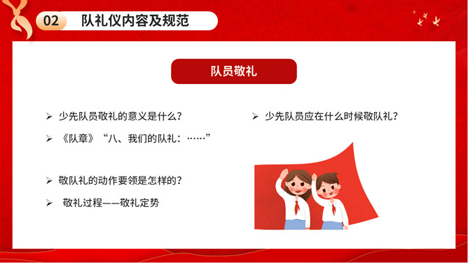 少先队队礼规范班会PPT模板。内容包括队礼仪性质与作用、队礼仪内容及规范、举行队活动仪式、低年级建队仪式。