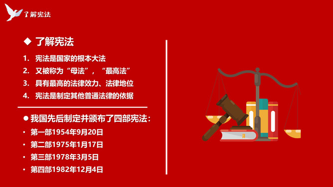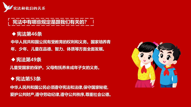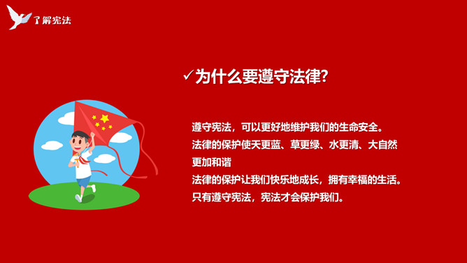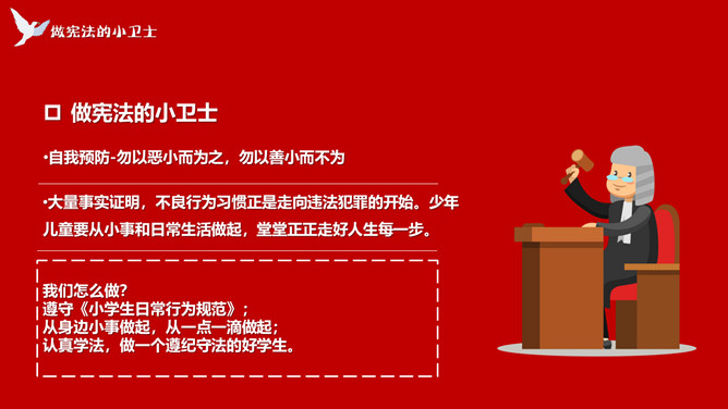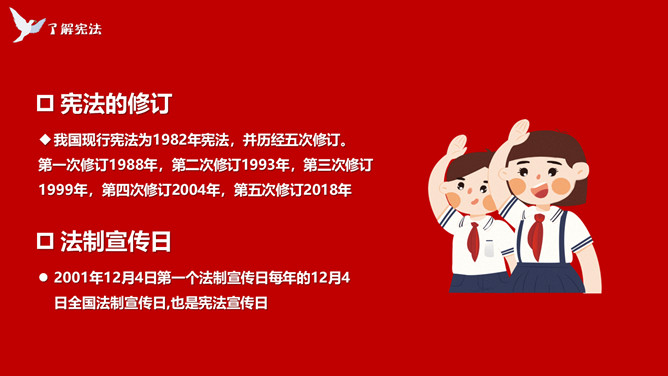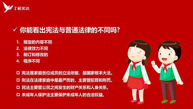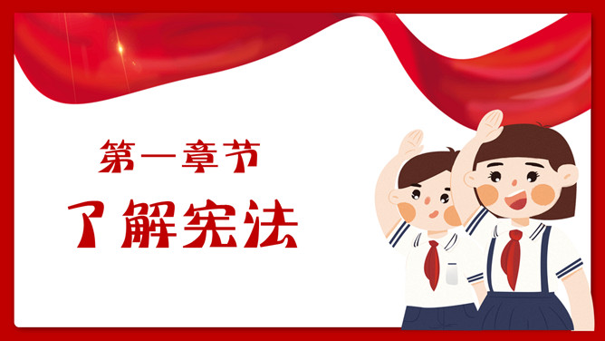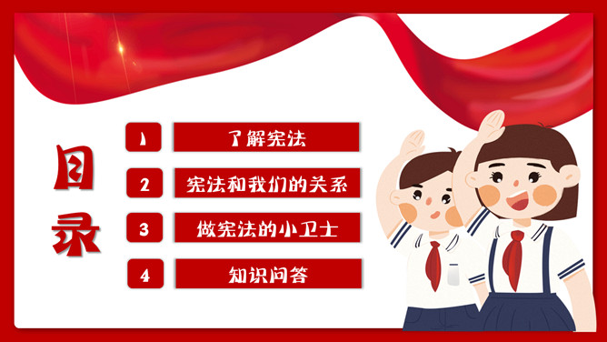 学宪法讲宪法班会课件PPT模板。内容包括了解宪法、宪法和我们的关系、做宪法的小卫士、知识问答。