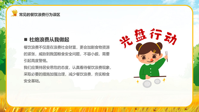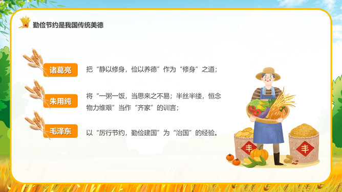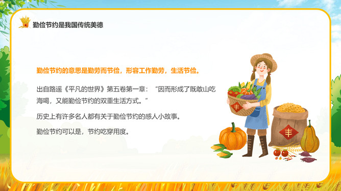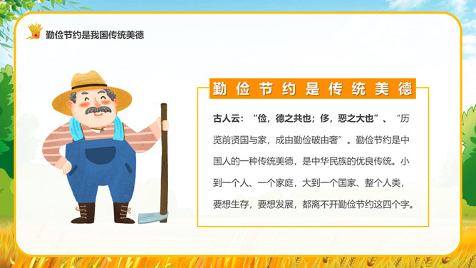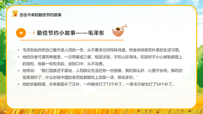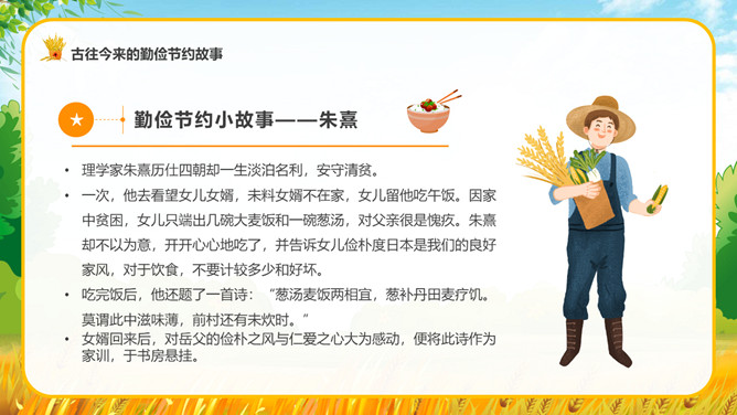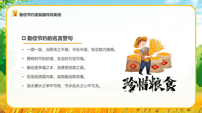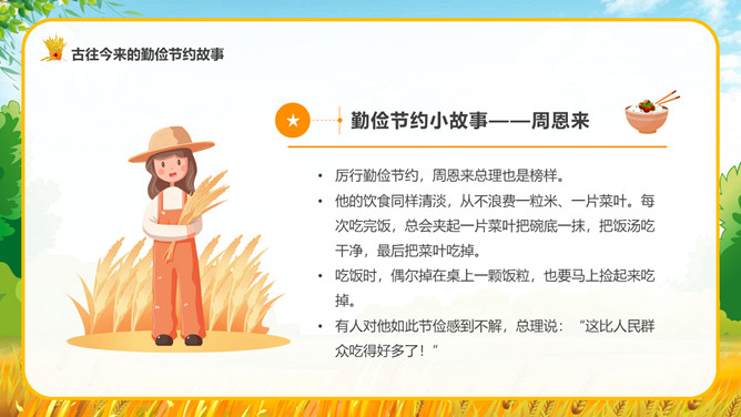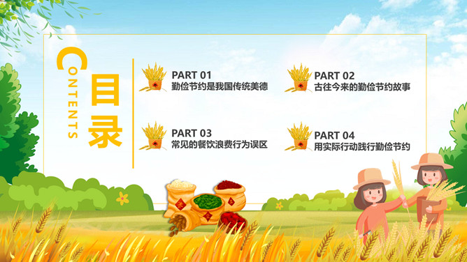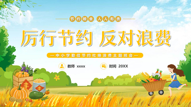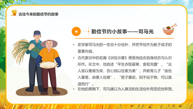 厉行节约反对浪费班会PPT模板。内容包括勤俭节约是我国传统美德、古往今来的勤俭节约故事、常见的餐饮浪费行为误区、用实际行动践行勤俭节约。
