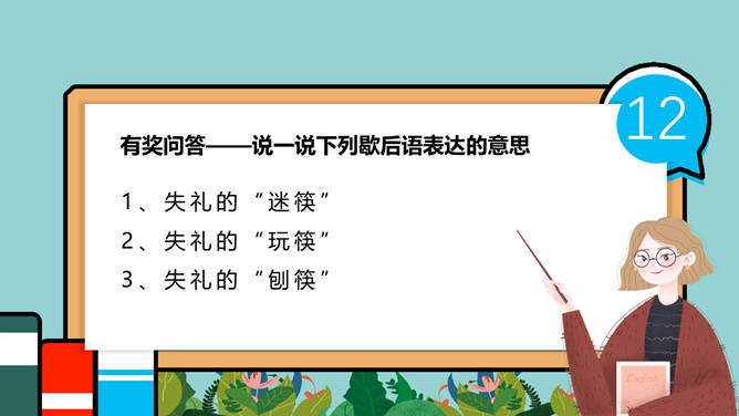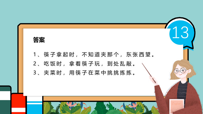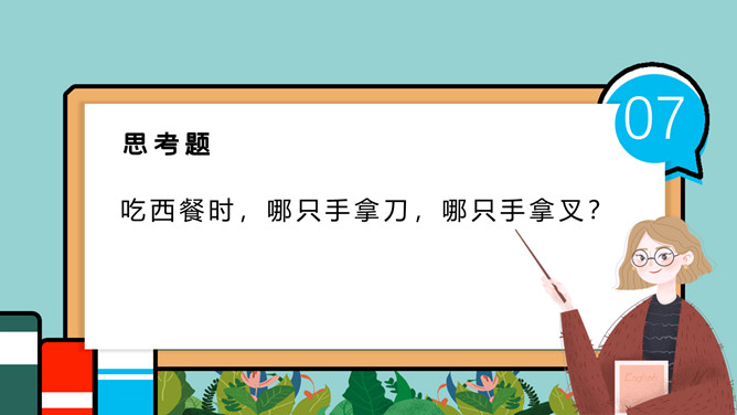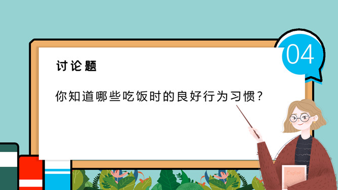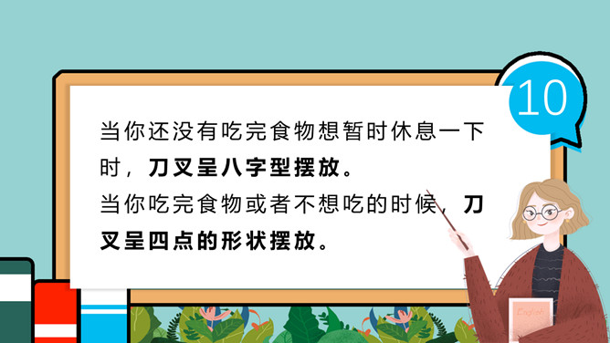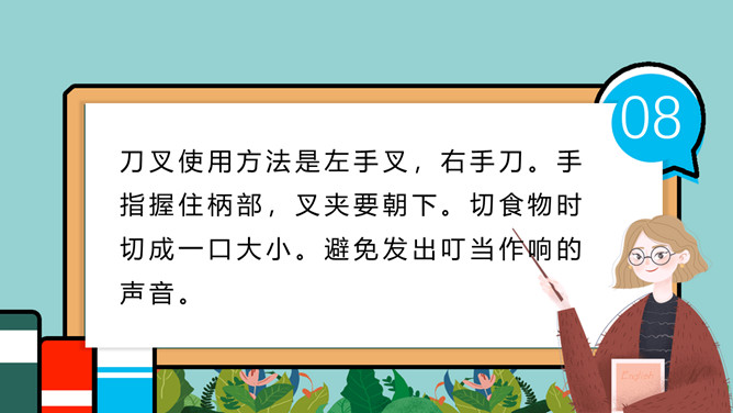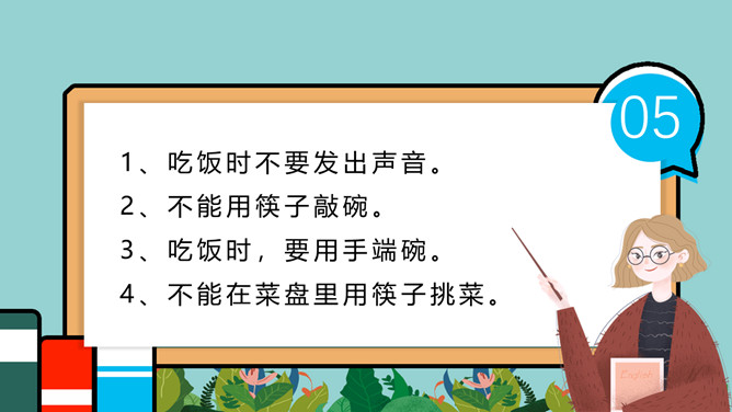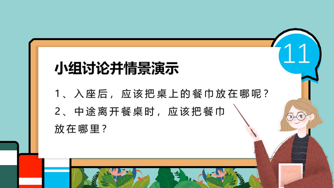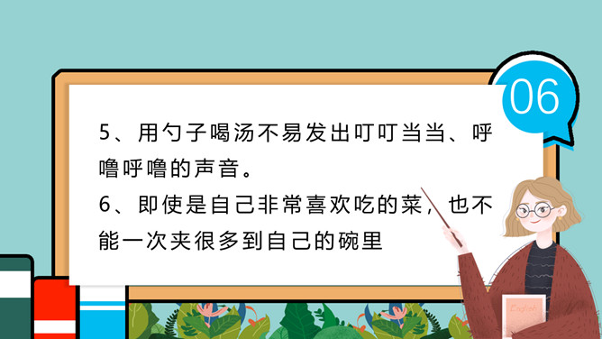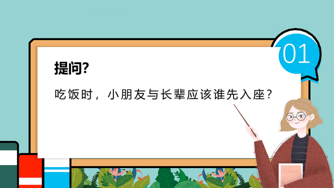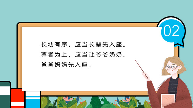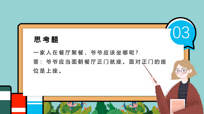 小学生餐桌礼仪班会PPT模板。吃饭时,小朋友与长辈应该谁先入座?长幼有序,应当长辈先入座。尊者为上,应当让爷爷奶奶、爸爸妈妈先入座。一家人在餐厅聚餐,爷爷应该坐哪?答:爷爷应当面朝餐厅正门就座。面对正门的座位是上座。