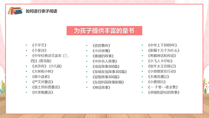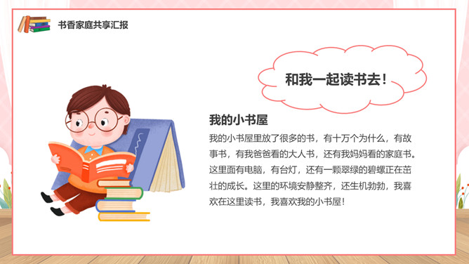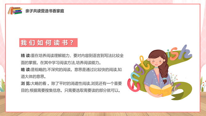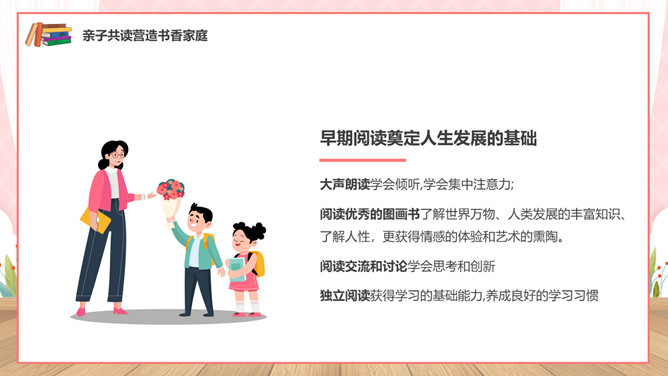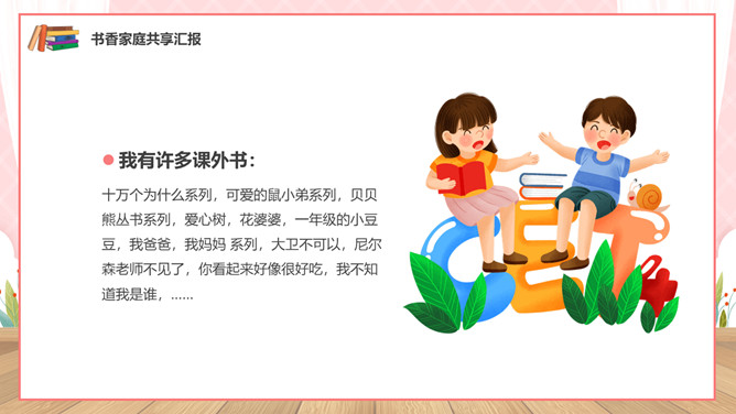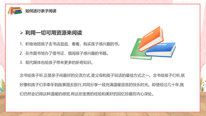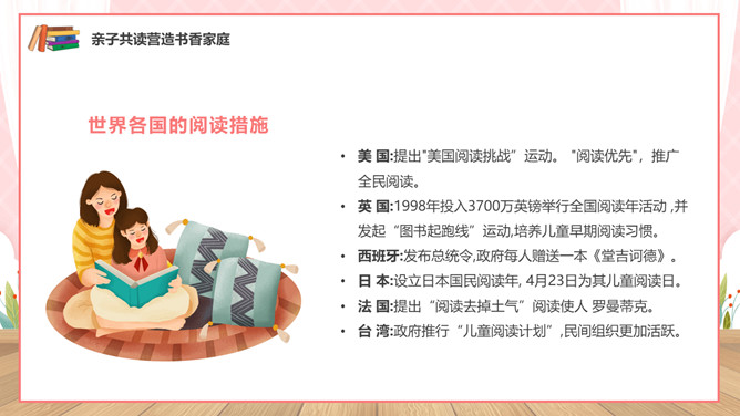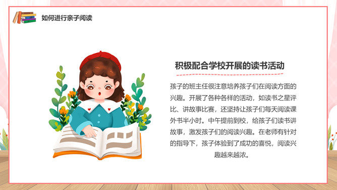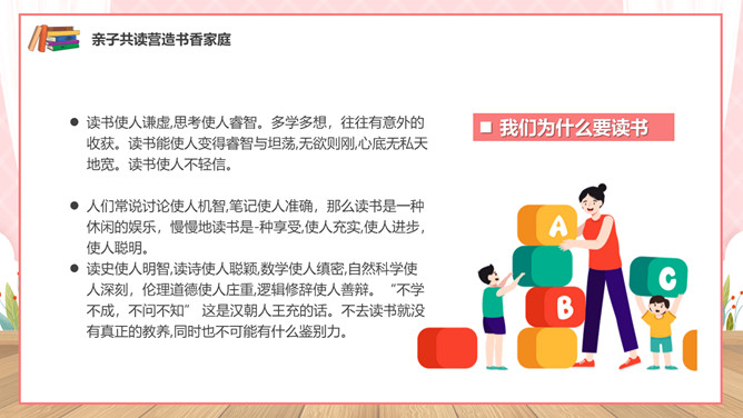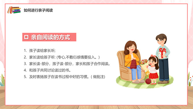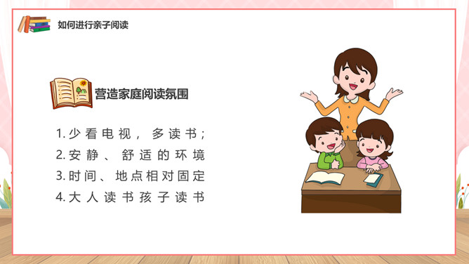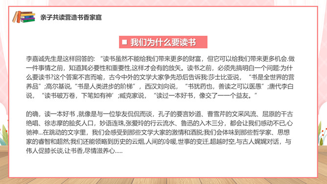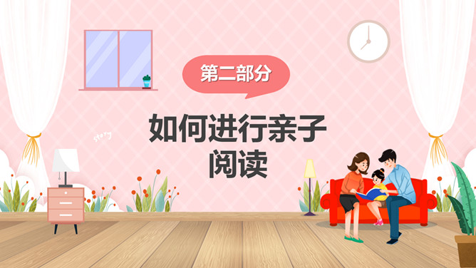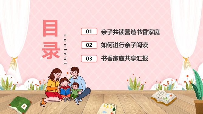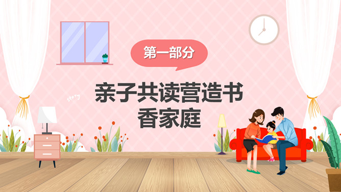 亲子阅读读书家长会PPT模板。内容包括亲子共读营造书香家庭、如何进行亲子阅读、书香家庭共享汇报。