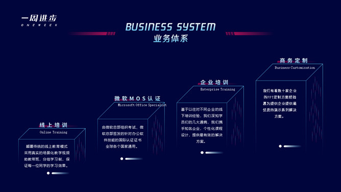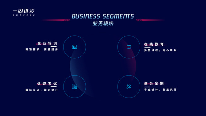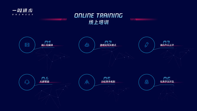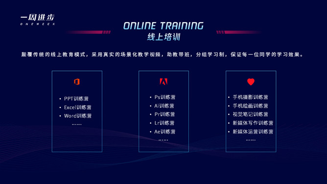 网络线上教育培训推介PPT模板。一套IT行业网络线上培训推广模板,深蓝背景,简约设计,很有科技感。
