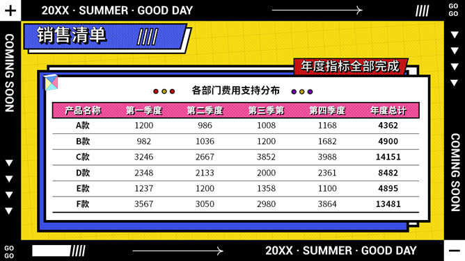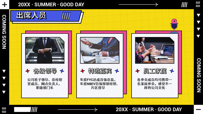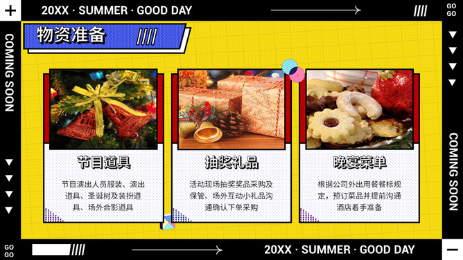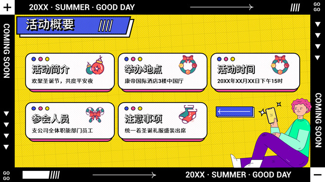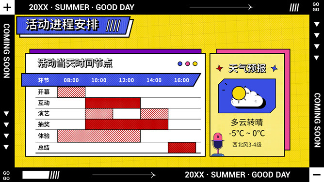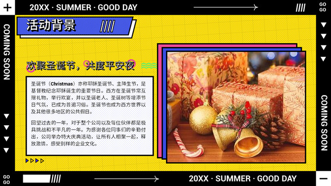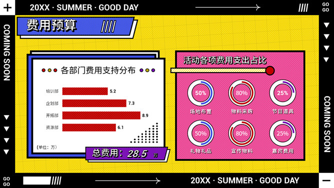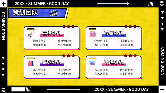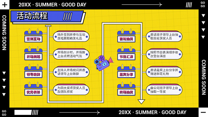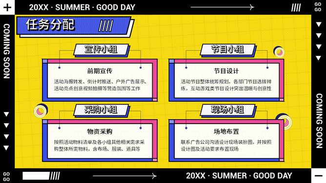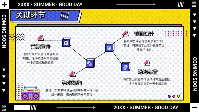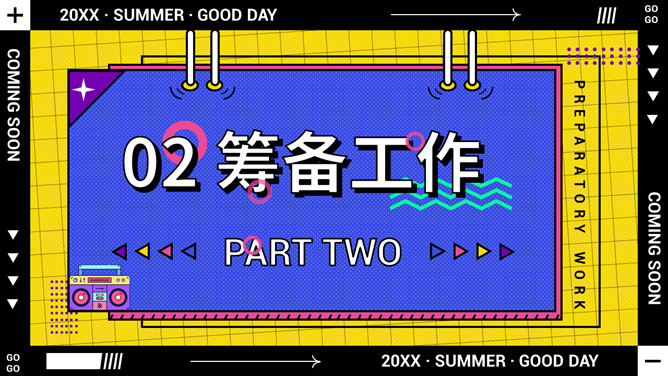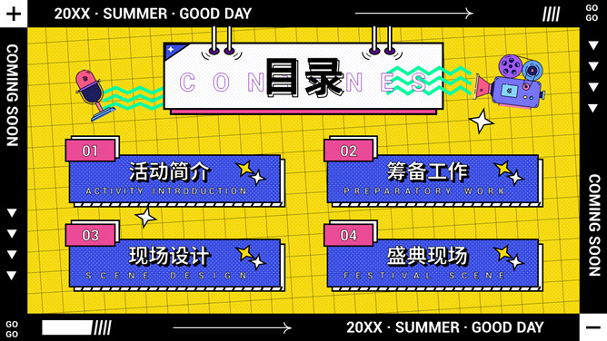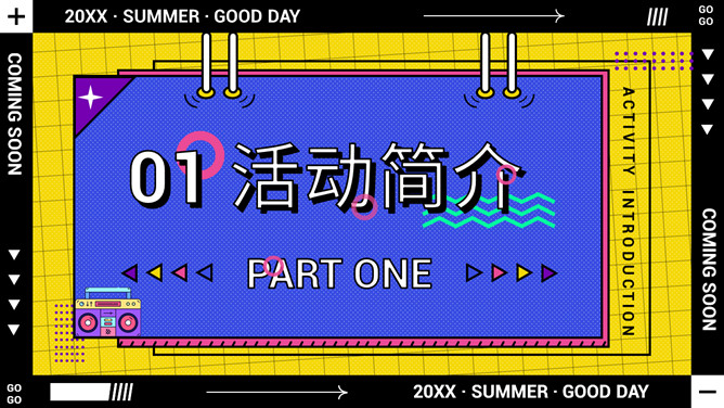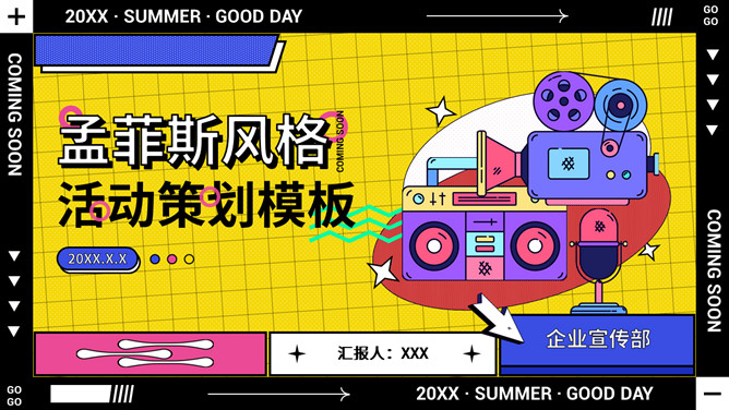 孟菲斯风格活动策划方案PPT模板。一套活动计划策划方案模板,时尚孟菲斯风格设计,大胆撞色配色。
