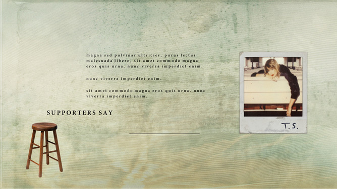 怀旧音乐海报风泰勒斯威夫特PPT模板。泰勒·斯威夫特(Taylor Swift),1989年12月13日出生于美国宾夕法尼亚州,美国女歌手、词曲作者、音乐制作人、演员。