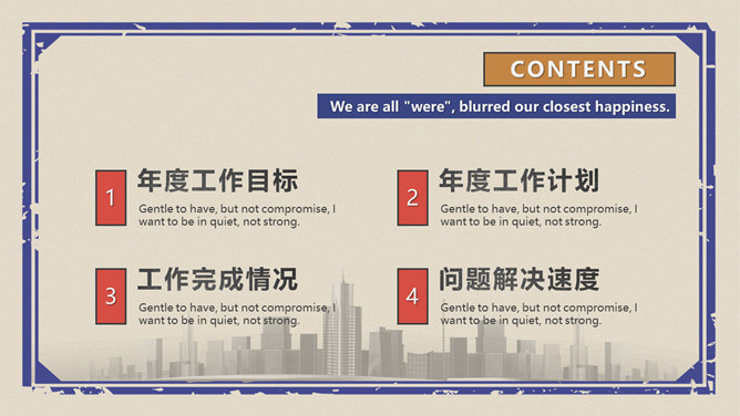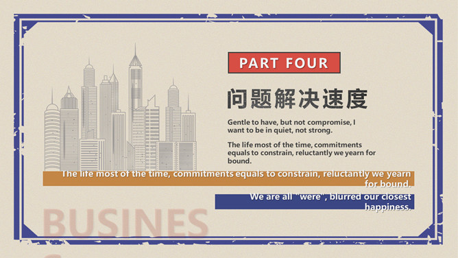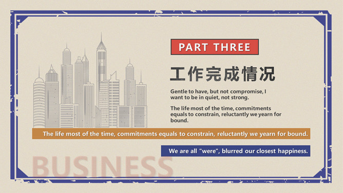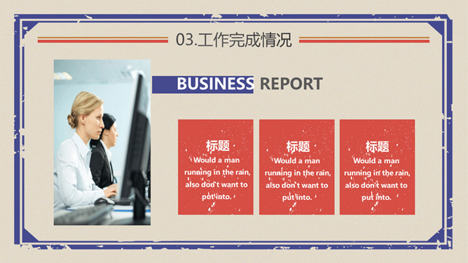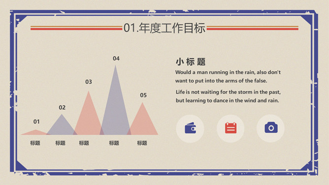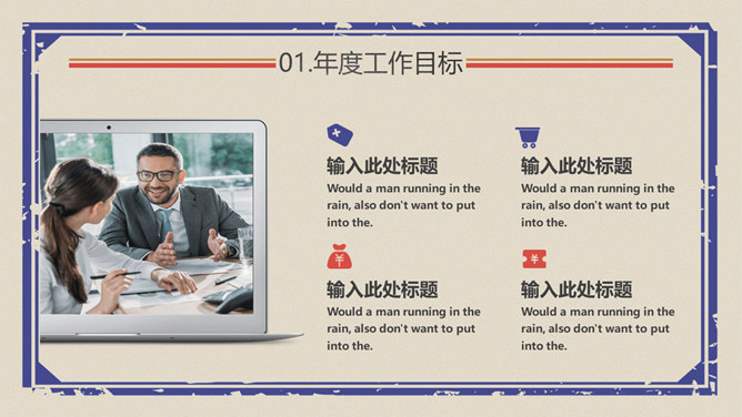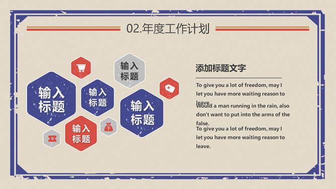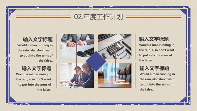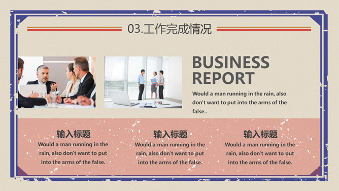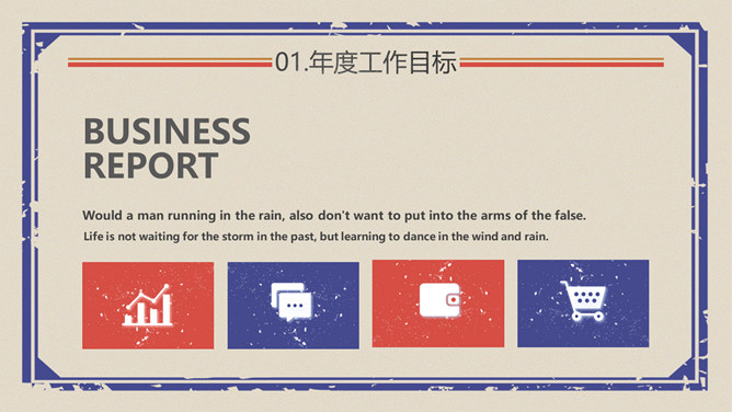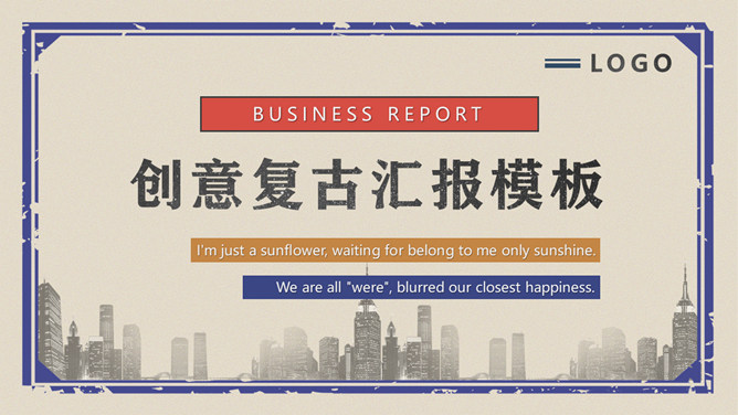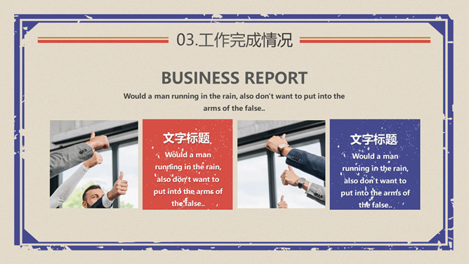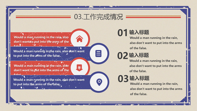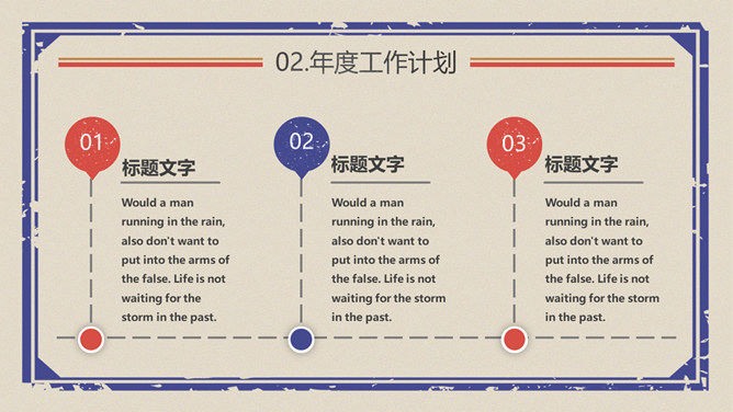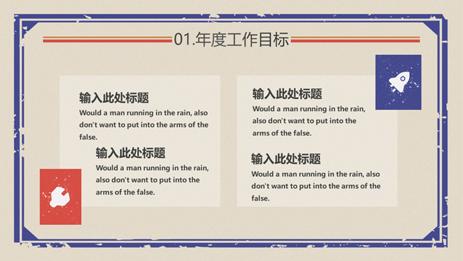 创意精美怀旧复古风PPT模板。一套创意设计模板,做旧复古怀旧效果设计,经典红蓝配色,设计精美。