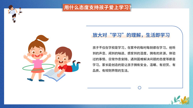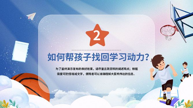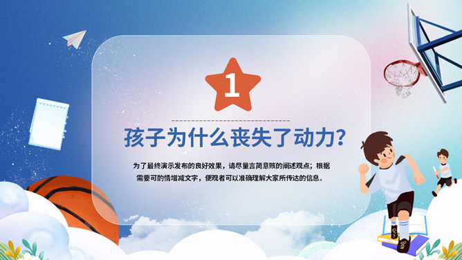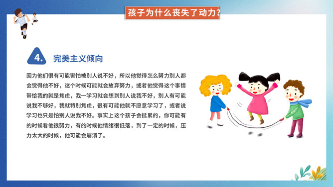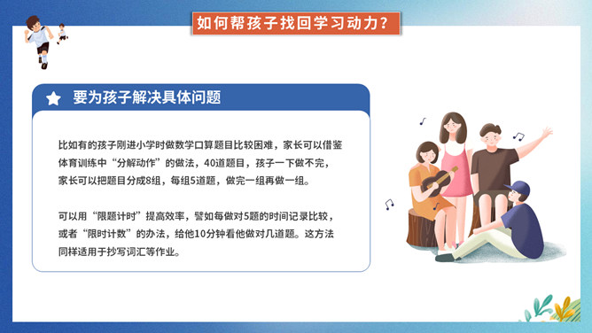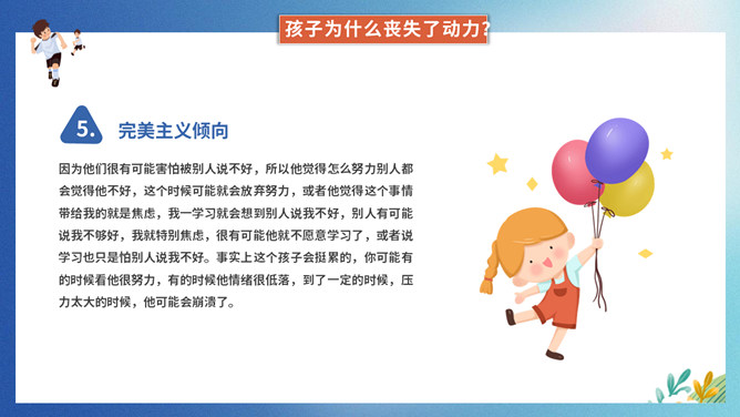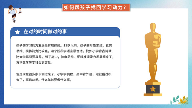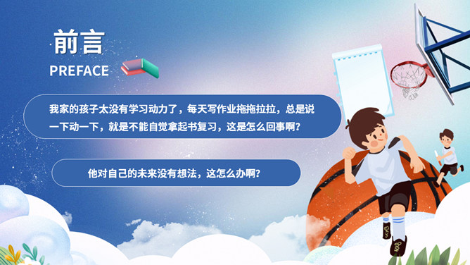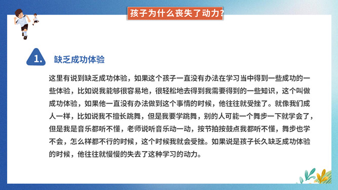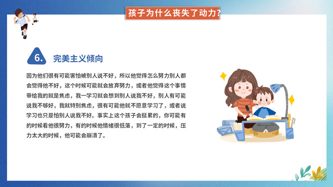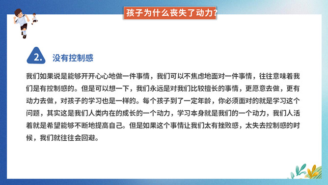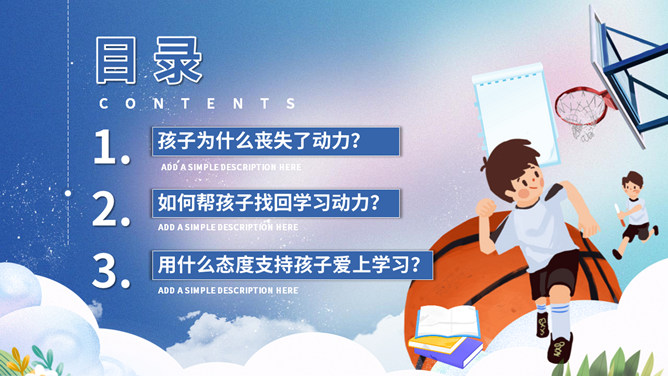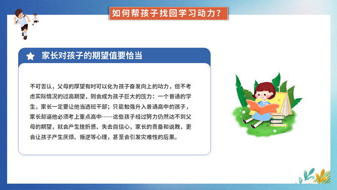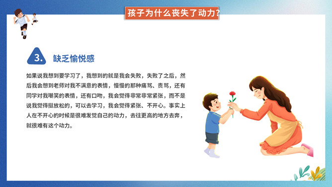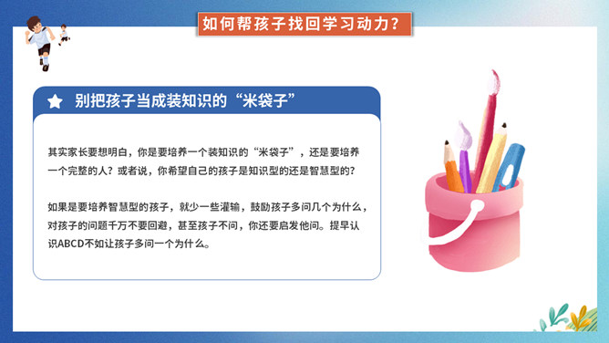 提升孩子的学习动力家长会PPT模板。内容包括孩子为什么丧失了动力、如何帮孩子找回学习动力、用什么态度支持孩子爱上学习。