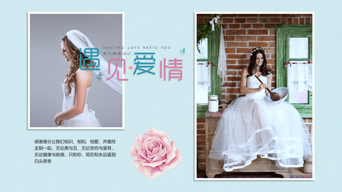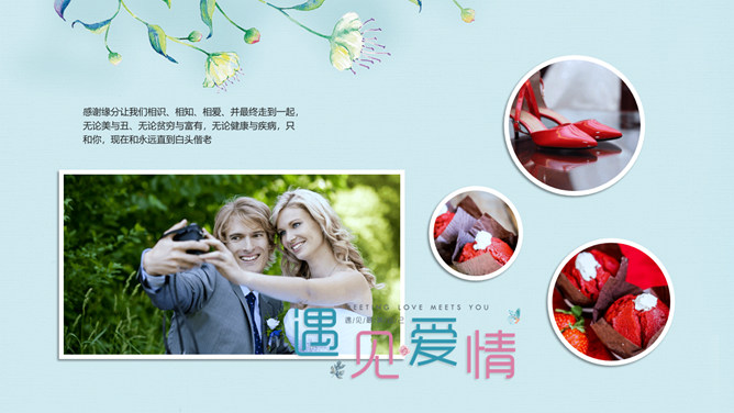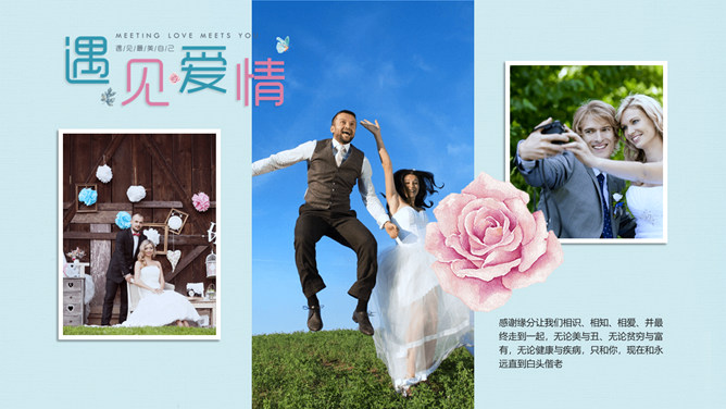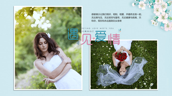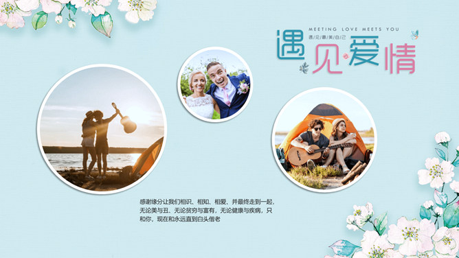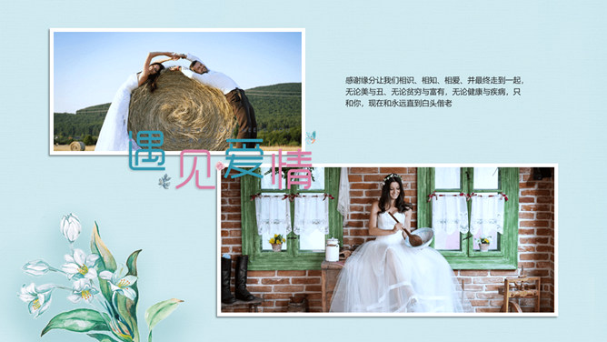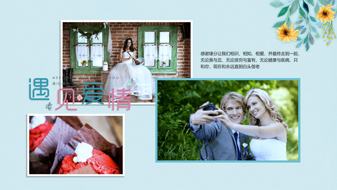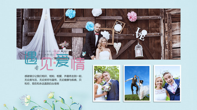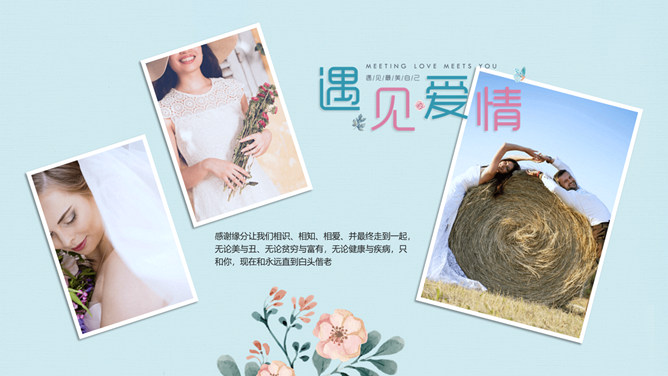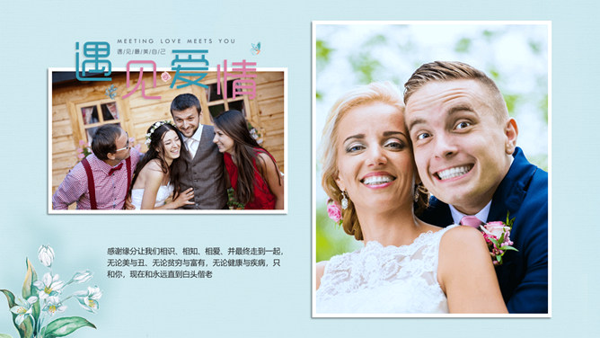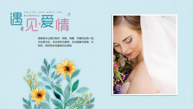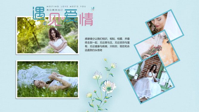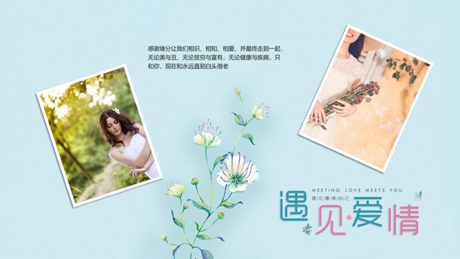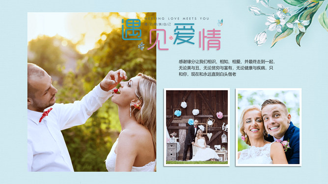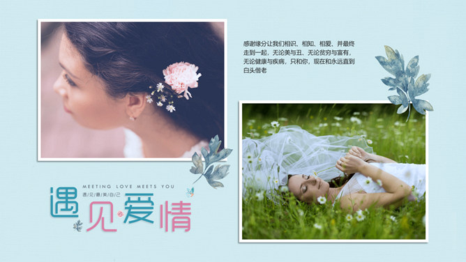 遇见爱情情侣婚礼相册PPT模板。一套结婚典礼婚纱相册模板,蓝色背景,唯美水彩花卉装饰,多种照片排版。