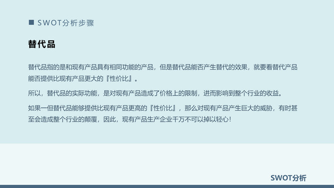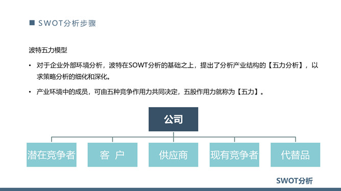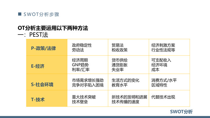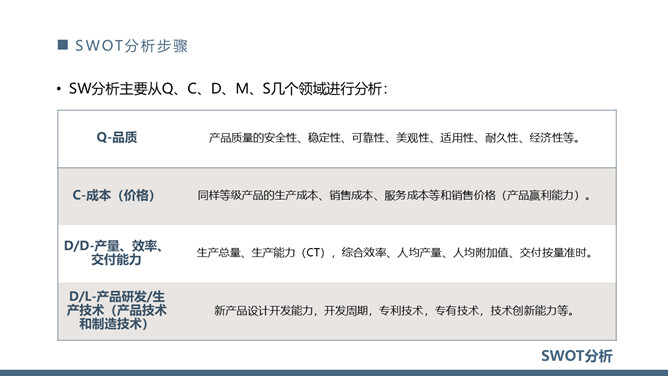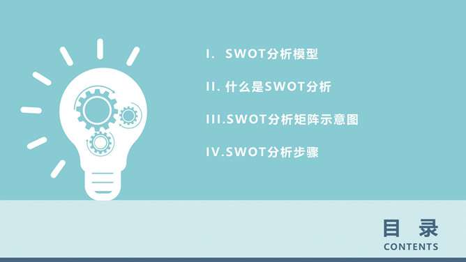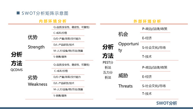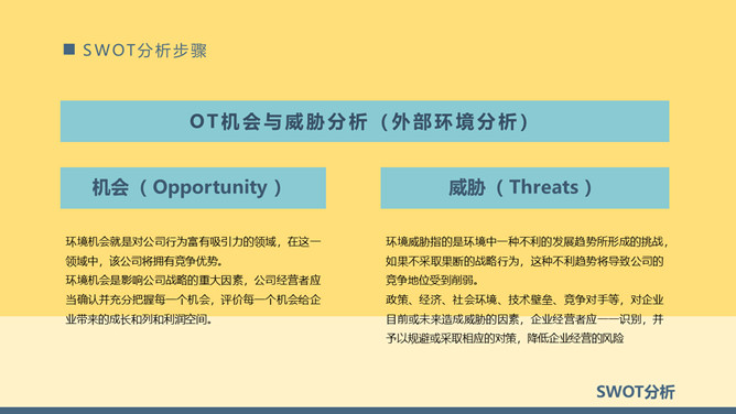 SWOT分析法培训课件PPT模板。内容包括SWOT分析模型、什么是SWOT分析、SWOT分析矩阵示意图、SWOT分析步骤。