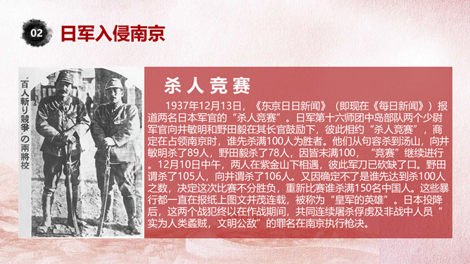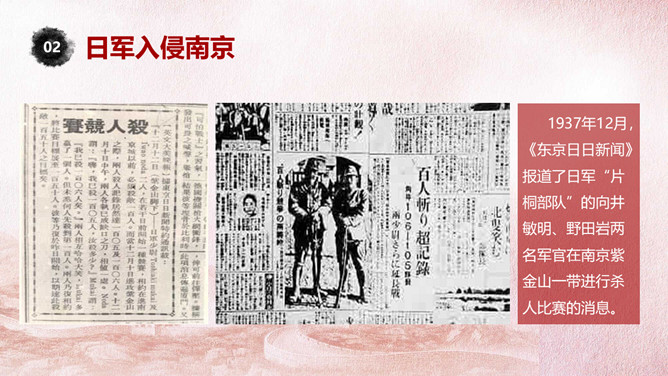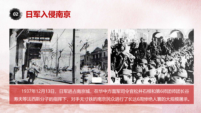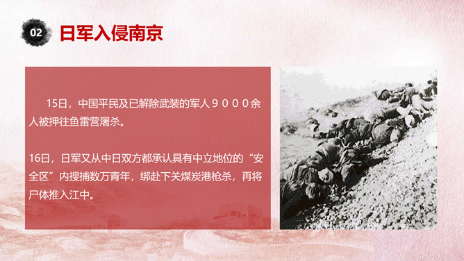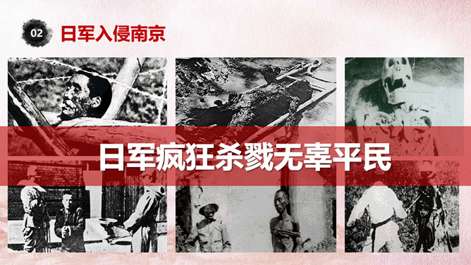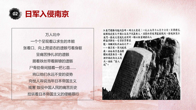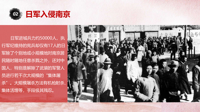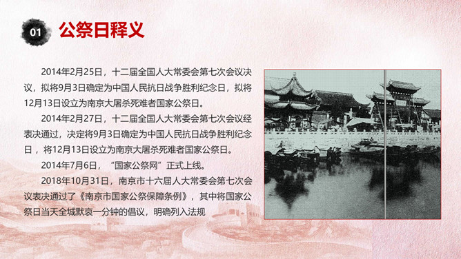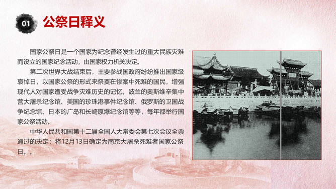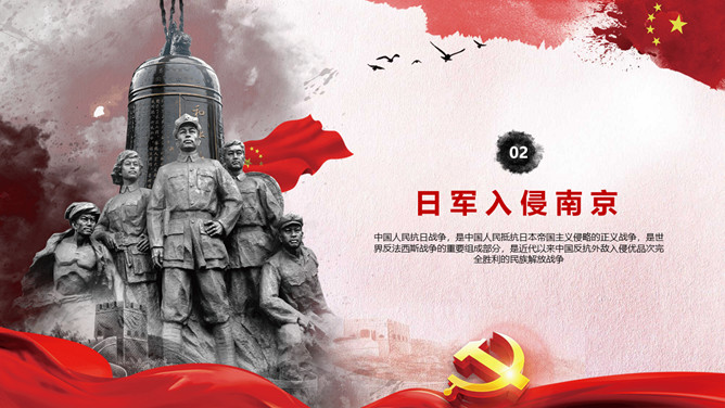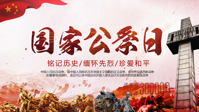 国家公祭日铭记历史PPT模板。一套国家公祭日主题模板,包括公祭日释义、入侵和铭记历史三部分。