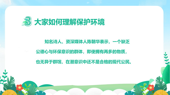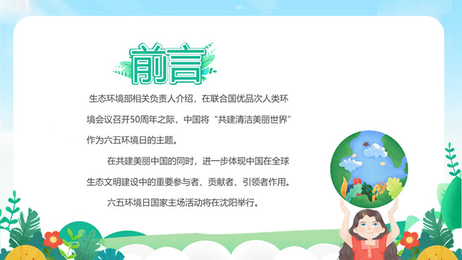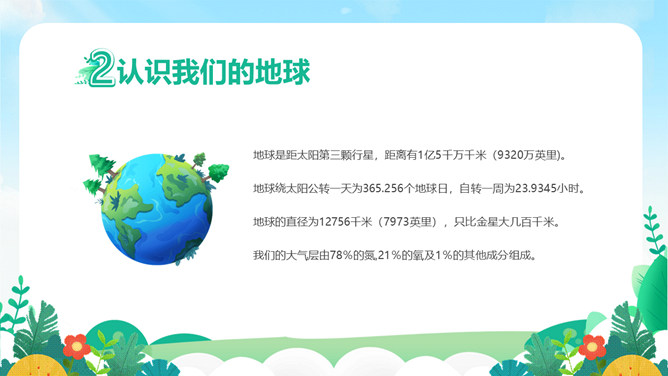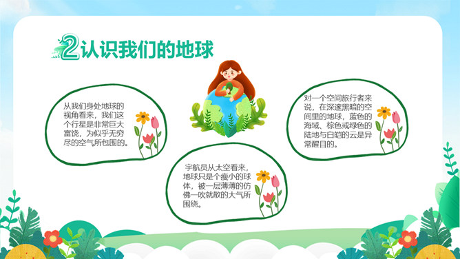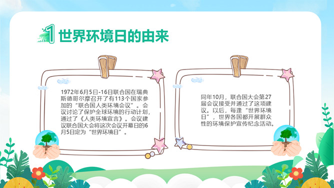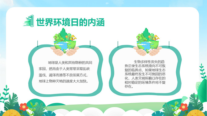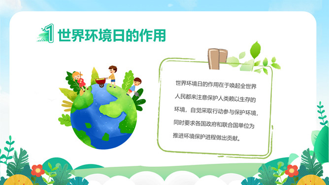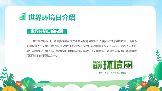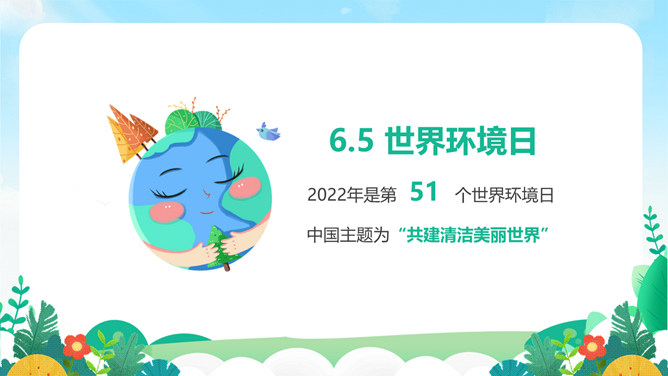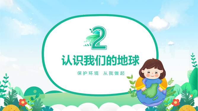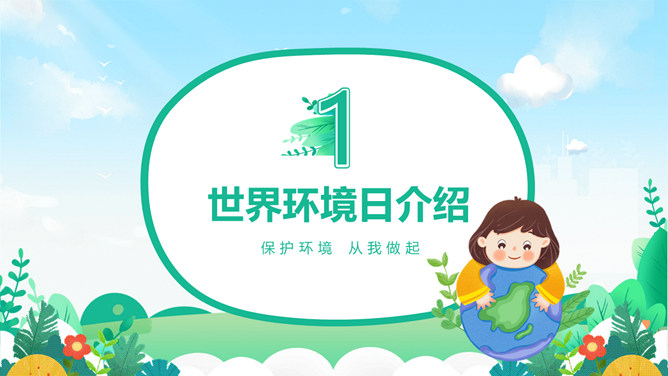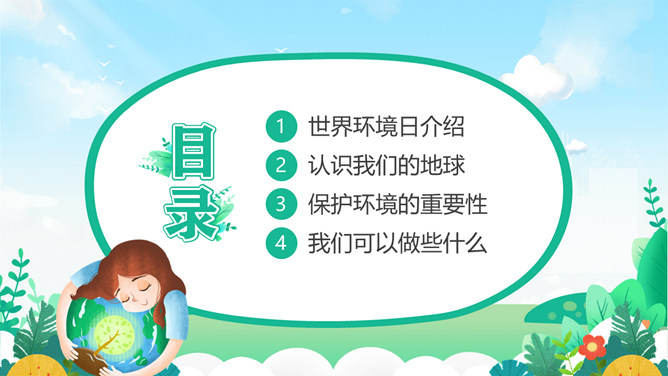 世界环境日保护地球班会PPT模板。包括世界环境日介绍、认识我们的地球、保护环境的重要性、我们可以做些什么。