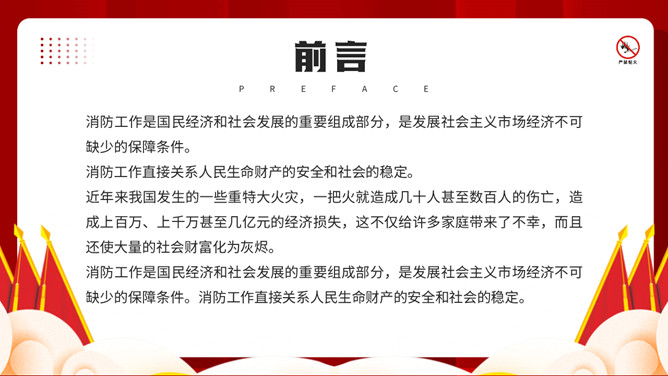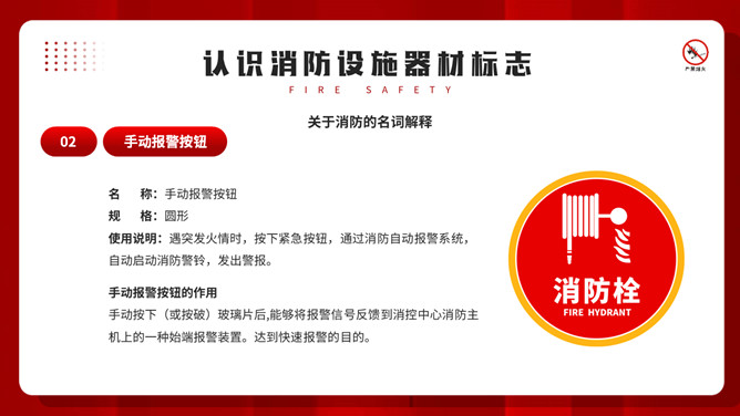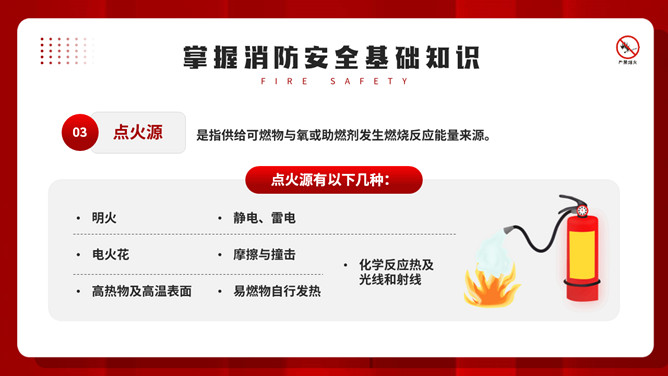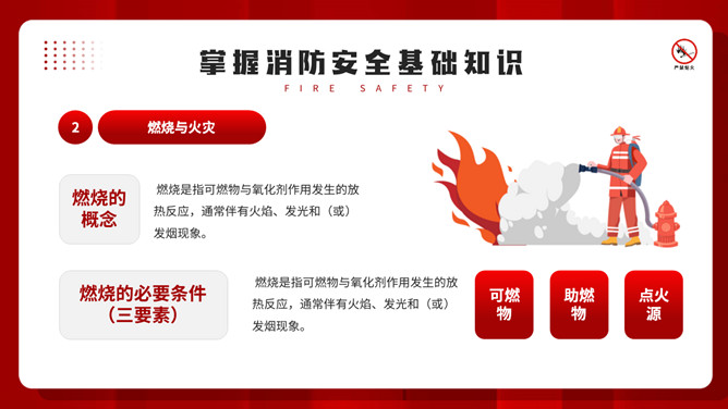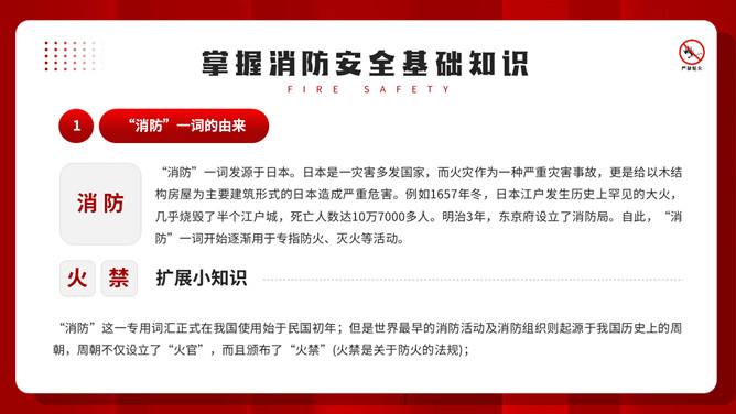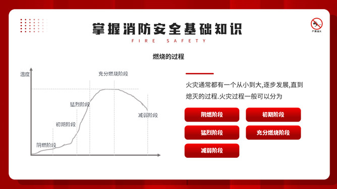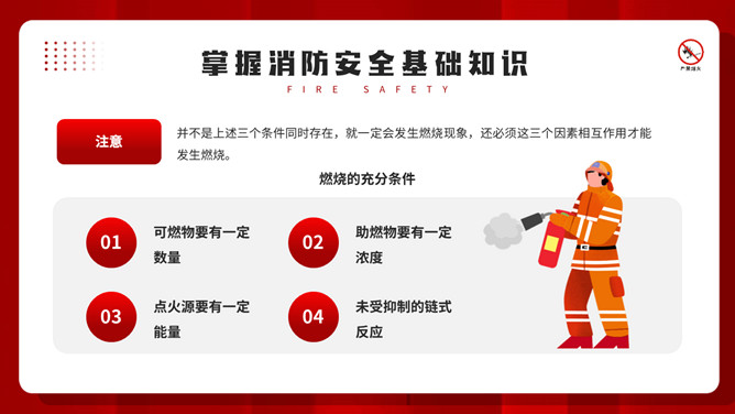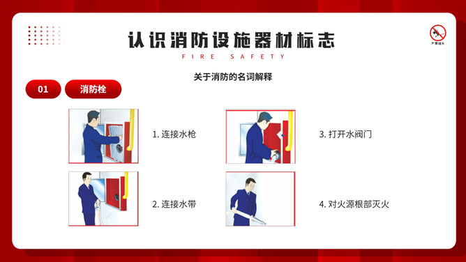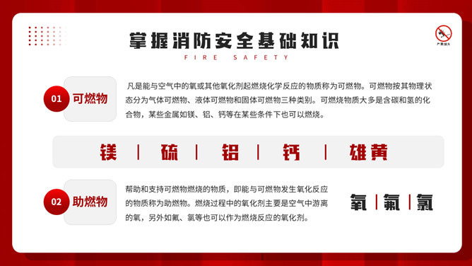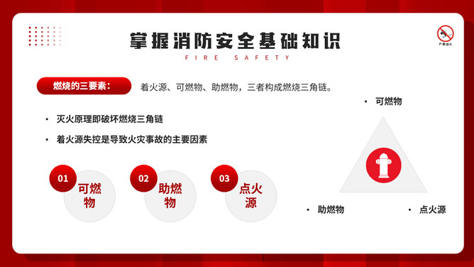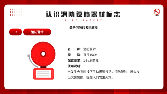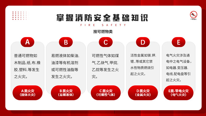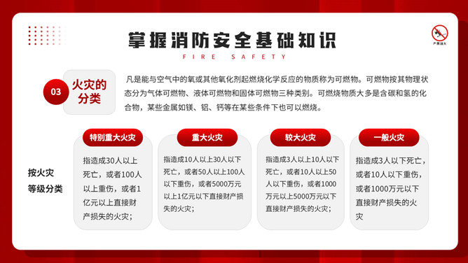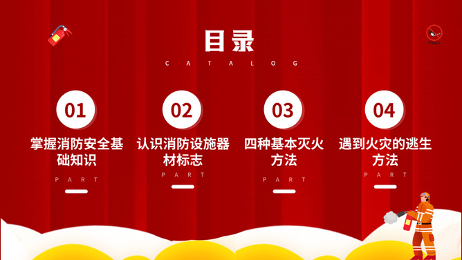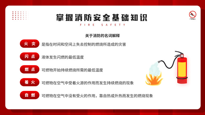 公共消防知识班会PPT模板。内容包括掌握消防安全基础知识、认识消防设施器材标志、四种基本灭火方法、遇到火灾的逃生方法。