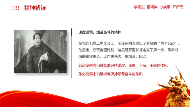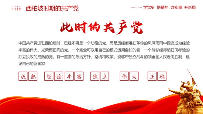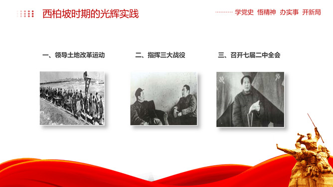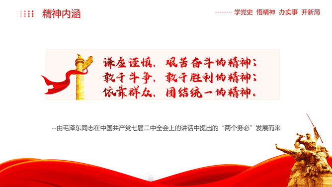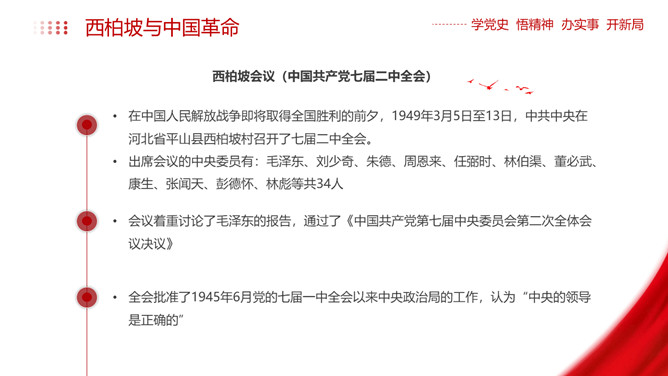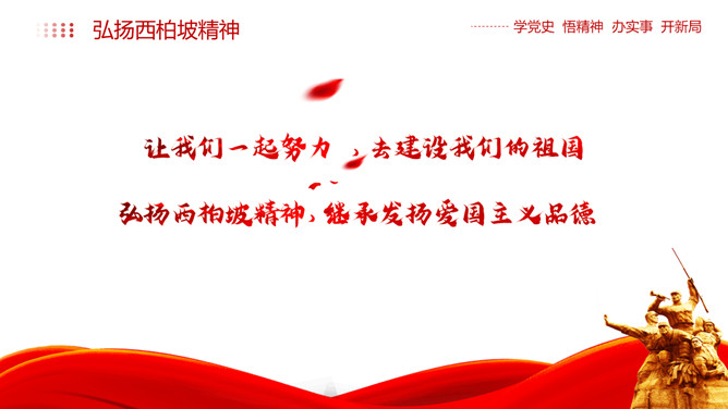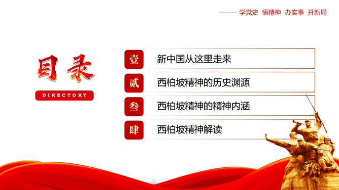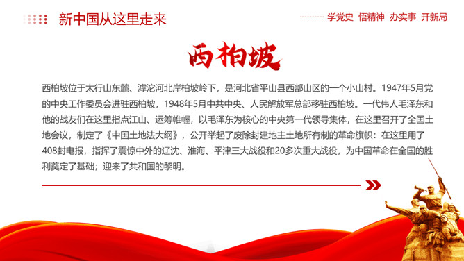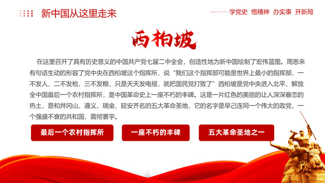 西柏坡精神价值与时代内涵PPT模板。内容包括新中国从这里走来、西柏坡精神的历史渊源和精神内涵、西柏坡精神解读。