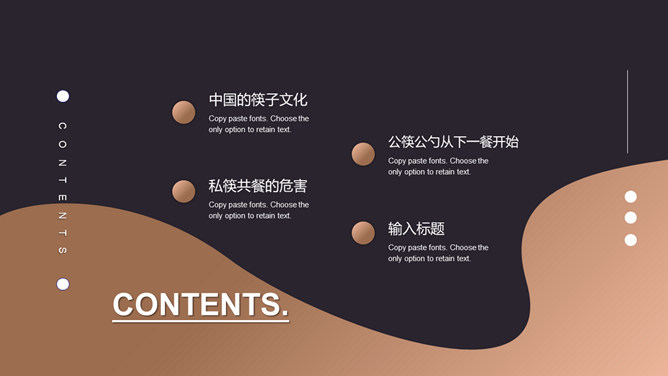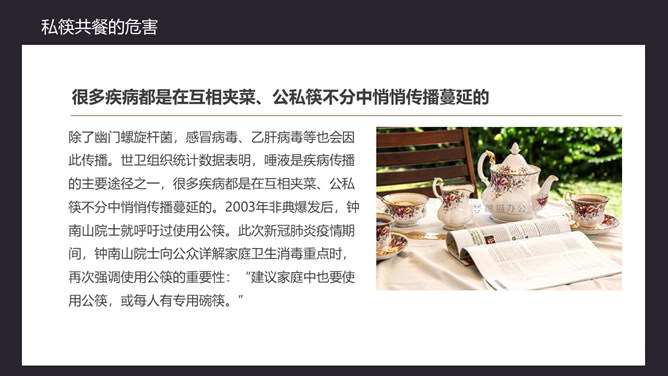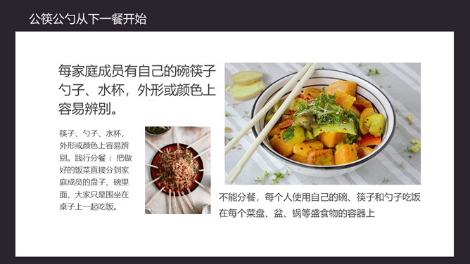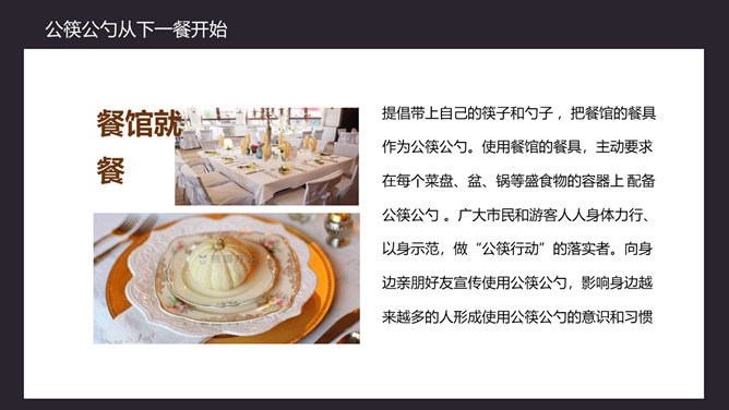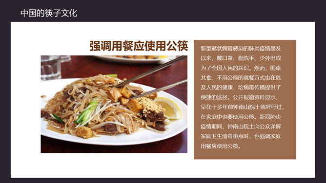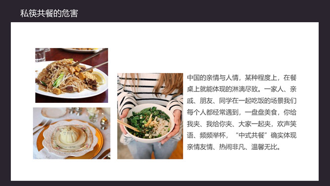 倡导文明就餐请用公筷公勺PPT模板。内容包括中国的筷子文化、私筷共餐的危害、公筷公勺从下一餐开始。